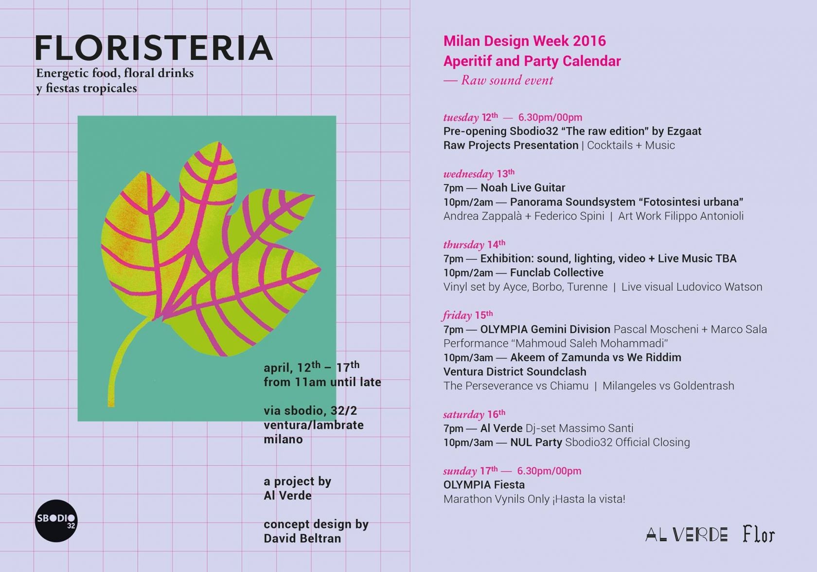In occasione del Salone, il Ventura District diventa bucolico. Massimo Santi, fondatore di Al Verde, e David Beltran, fondatore di Flor, ricopriranno uno spazio industriale di fiori, colori, luci e fragranze primaverili. All’interno di questa oasi troverete cibi e drink floreali, da gustare durante i numerosi eventi e live sessions che la animeranno. Dal 12 al 17 aprile, via Sbodio 32, Milano-Lambrate. Tutti i dettagli qui.