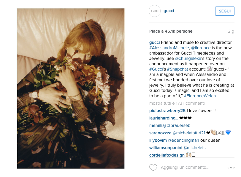 Alexa Chung announced the big news through Gucci's Snapchat account: Florence Welch is the new face of the brand. The British singer, pluri-nominated at the Grammy Awards 2016, will be Gucci's ambassador for the timepieces and jewelry lines.