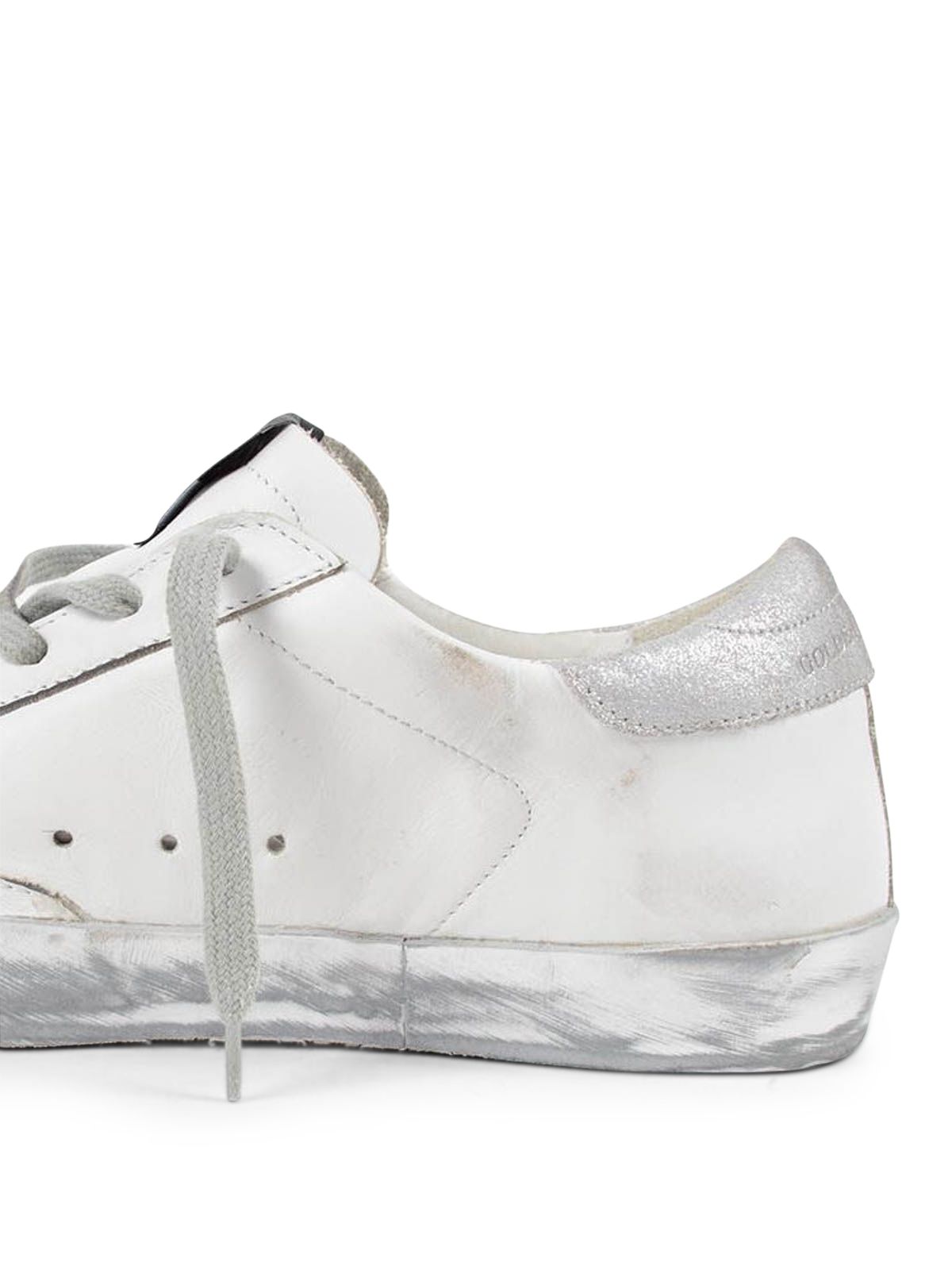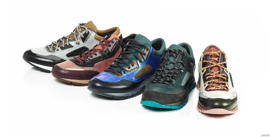 Back in 2014 the Parisian fashion house made a first attempt to mix running shoe silhouette with heavy duty details. We can compare Lanvin Cross training sneakers with Balenciaga runway shoes in terms of shapes and color pattern. Even if one of Triple-S colorways presented during the show totally brings up in mind the super-famous and heavily-diffused Valentino Runners in their first iteration with smooth leather upper in greysh and greenish tones with fluo tassels detail. Also the pre-distressed leather could remind of some Golden Goose Superstar leather distressing.