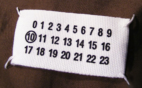 Quattro cuciture bianche, un’etichetta senza nome con solo una serie di numeri da 0 a 23, dove la cifra cerchiata indica la linea di appartenenza del capo.