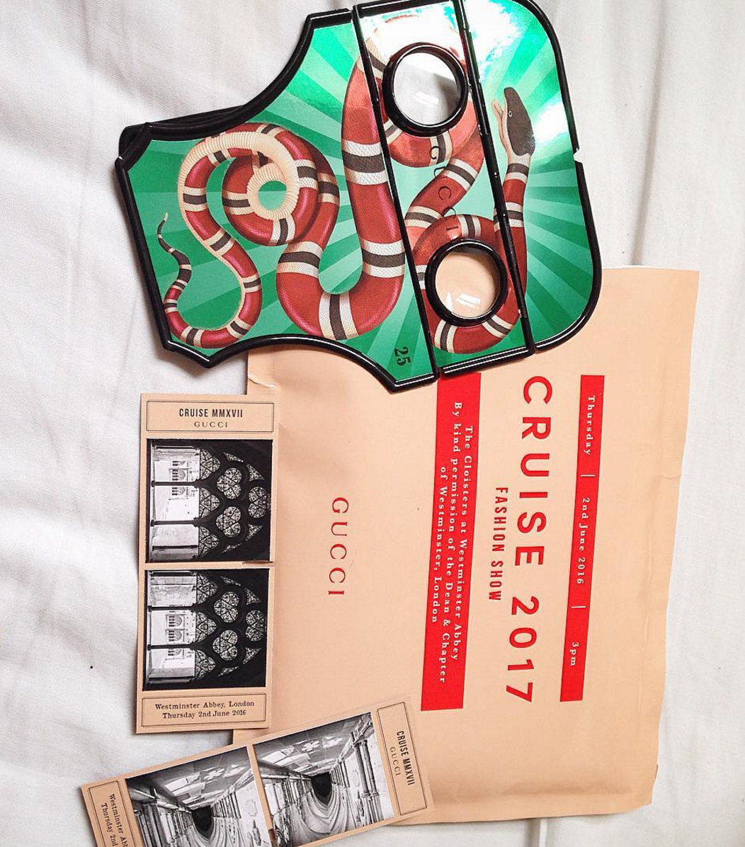L'avventura Gucci Cruise 2017 inizia con l'invito- serpente, che si trasforma in stereoscopio vintage, e continua con una cena di benvenuto al Sexy Fish, ristorante di cibo Asian Fusion al cui interno si posso ammirare opere d'arte di Frank Gehry e Damien Hirst.