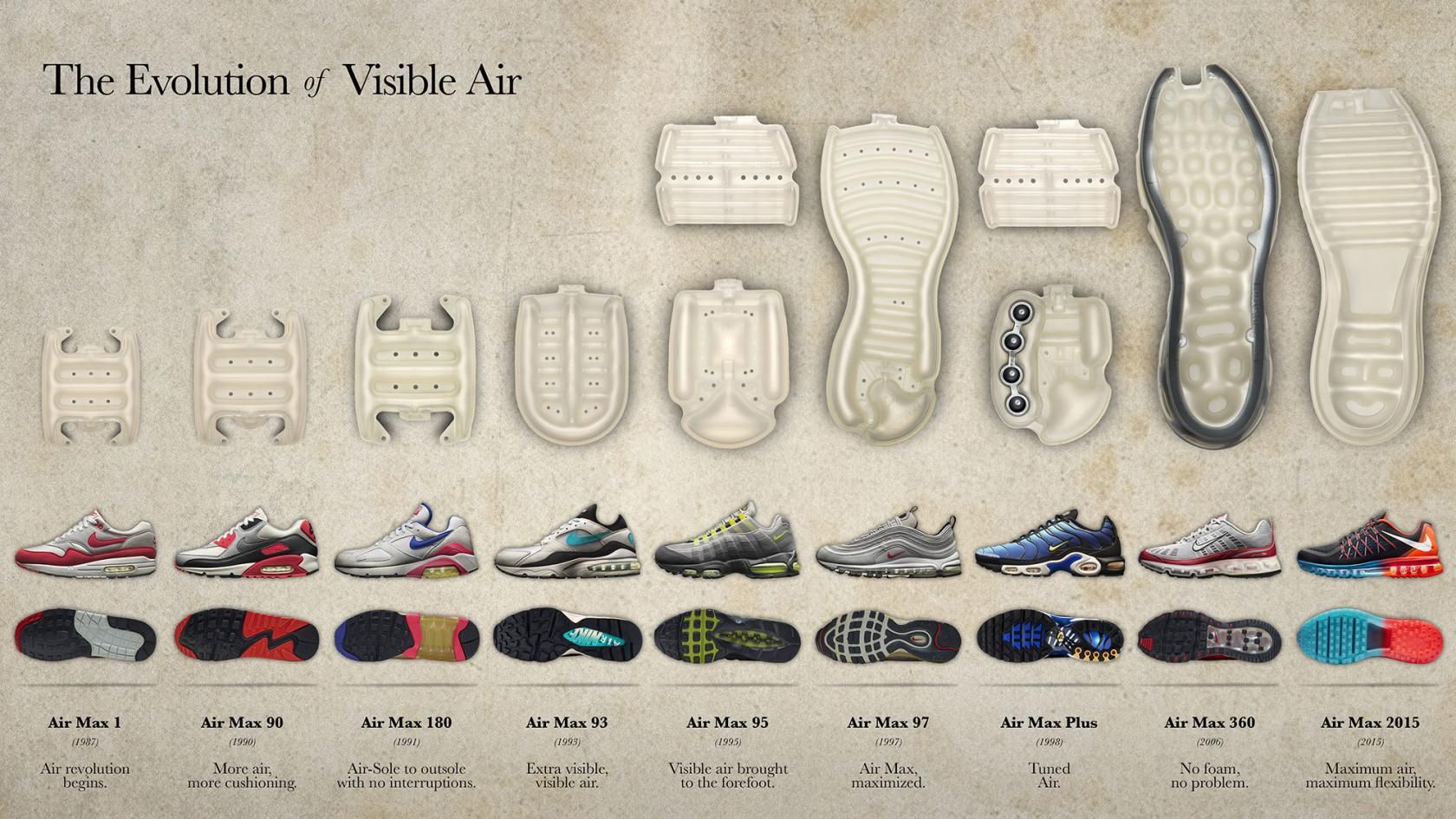 Il primissimo esemplare di Nike Air fu concepito alla fine degli anni ‘70, più precisamente nel 1977, quando la mente geniale dell’ingegnere aerospaziale Frank Rudy ideò un sistema air-bag applicabile alla suola di una scarpa. Convinto dell’originalità della sua idea, Rudy fece rotta verso Beaverton, vicino Portland, dove si trova il quartier generale di Nike, e presentò il progetto al co-fondatore del brand Phil Knight. La tecnologia era interessante e l’idea molto promettente, ma restava un problema: come far capire al pubblico la grandezza della tecnologia AIR – o, più banalmente, che cosa significasse. A questo però, pensò Tinker Hatfield, storico designer di Nike e architetto, a cui venne in mente di creare un’apertura sul tallone in modo che la tecnologia Air fosse immediatamente visibile, ispirandosi al Centre Pompidou di Parigi i cui meccanismi interni sono visibili anche dall’esterno. Nacque così la tecnologia più all’avanguardia di sempre nel mondo delle sneakers, che fece di Nike il brand prediletto da runners e sportivi in generale.