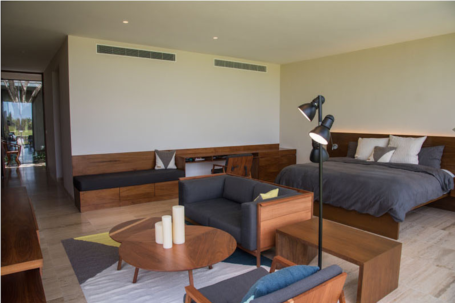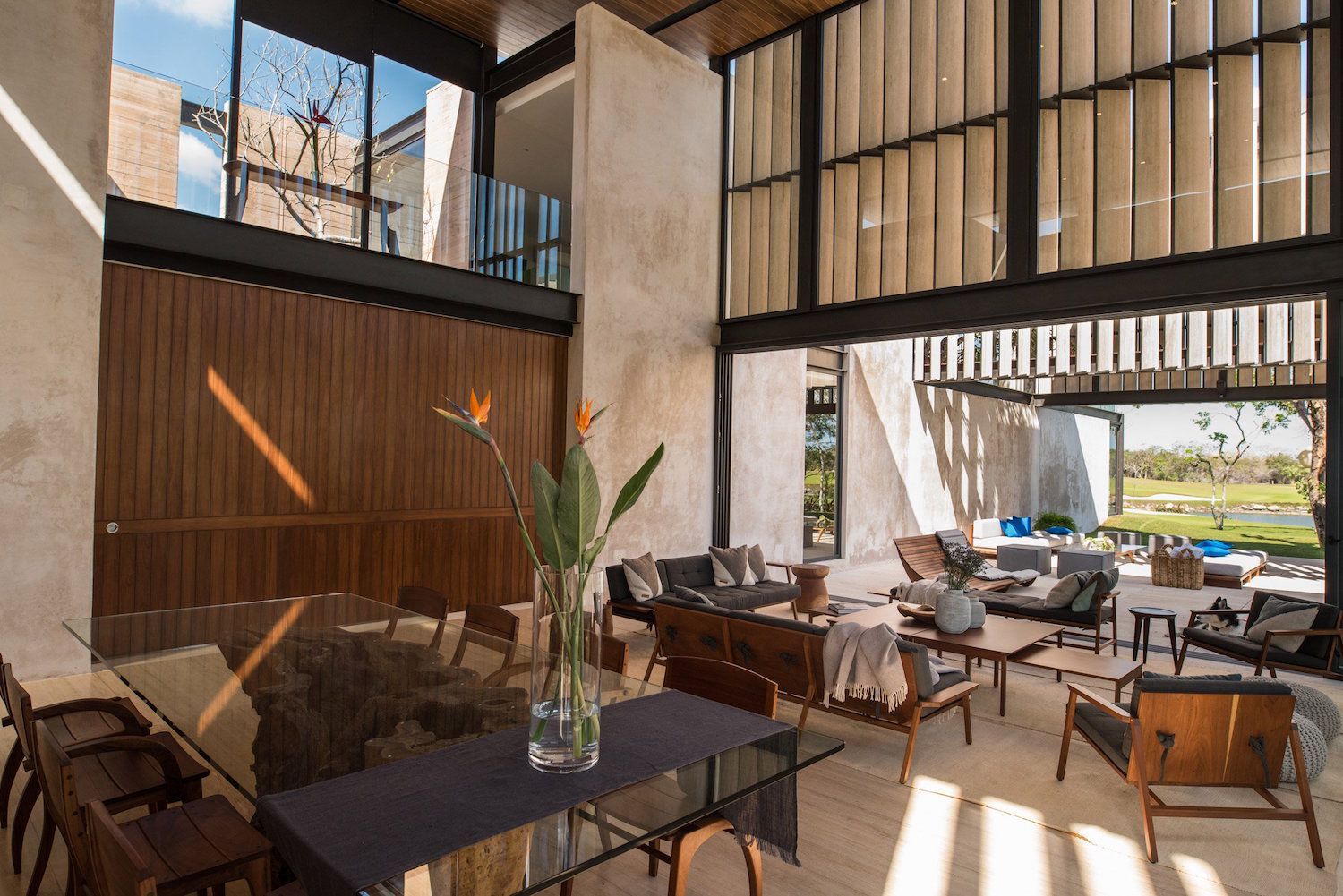 Ogni coppia di questi volumi è caratterizzata da facciate che la rendono riconoscibili le sue funzioni e interni nei quali predominano l’uso del legno e del colore grigio. Il paio composto da pareti di marmo a cassettoni ospitano gli spazi sociali: la sala da pranzo, che affaccia da un lato su un campo da golf e dall’altro sulla piscina; un’area salotto, al piano superiore, con grandi porte che si aprono su una terrazza con balaustre vetrate.