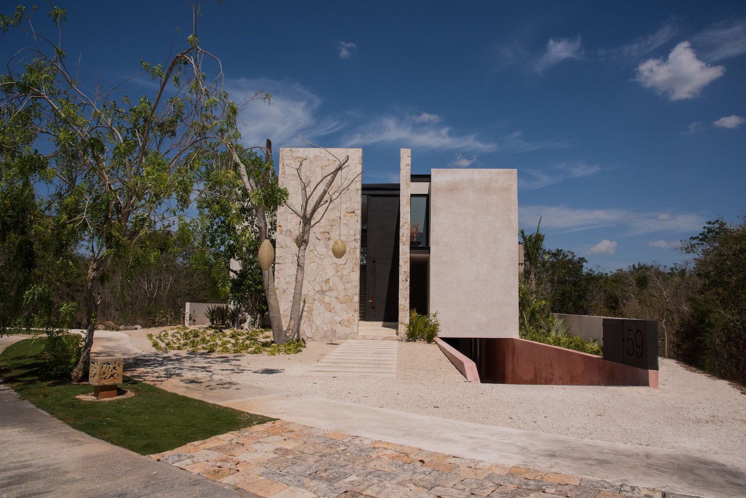 Ad esempio i muri sopraelevati, ricoperti di lamelle, che formando un baldacchino sopra la terrazza, sono costruiti con pietra, marmo e Chukum, una finitura a base di resina d’albero e calcare; mentre le pareti in cemento del vialetto sono colorate in rosa per assomigliare alle tonalità di rocce, pareti e strade che hanno un tono che vira sul rosso.