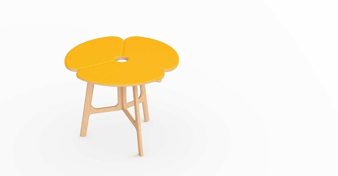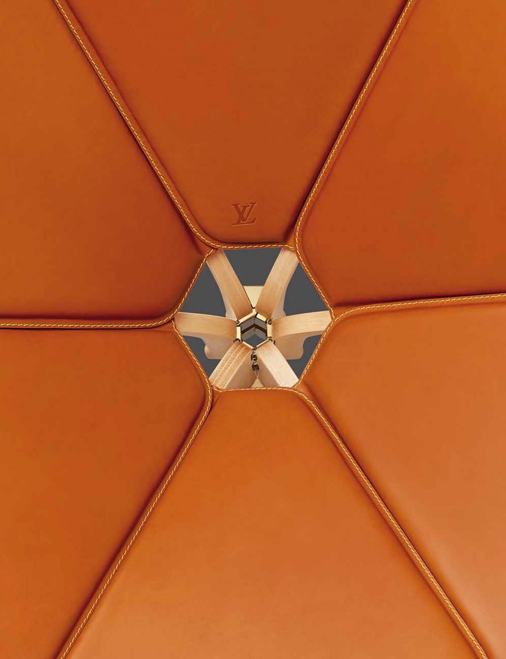 Il Concertina Table di Raw Edges si ispira al fiore del Monogram, simbolo della Maison Louis Vuitton dal 1896. L’eleganza delle gambe in legno di frassino e del top sagomato a trifoglio, contrastano armoniosamente con la pelle di vitello di colore giallo che lo ricopre - e che dona all’oggetto quello che i designer definiscono una “presenza speciale”.