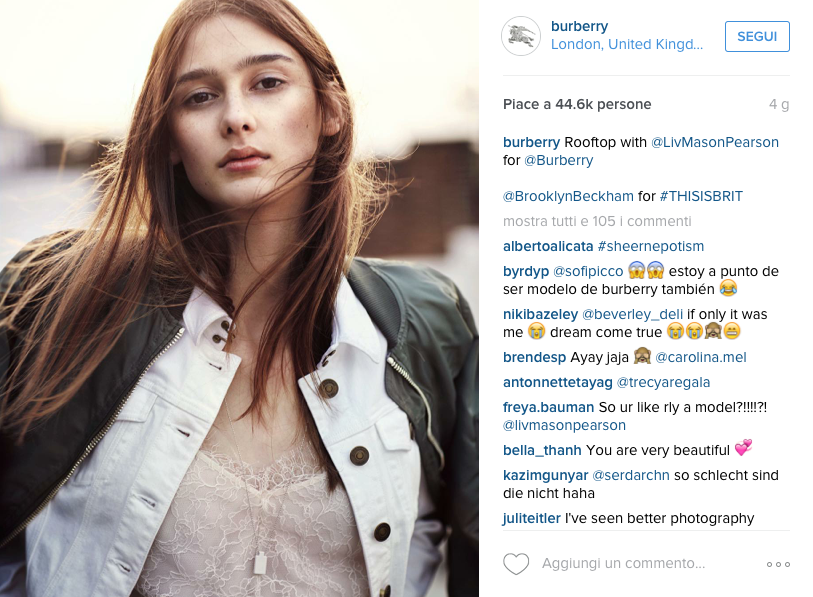 Ad esempio, il profilo Instagram di Brooklyn Beckham ha quasi 6 milioni di followers contro i “pochi” 5 mila di Chris Floyd. È comprensibile allora la scelta di un brand come Burberry di includere nella propria immagine un personaggio pubblico con così tanta notorietà mediatica. Infatti, lo shoot è stato ampiamente seguito sui social, dando vita a una meta-pubblicità, una “pubblicità dentro la pubblicità”.