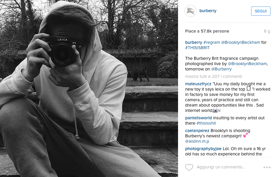 La scorsa settimana Brooklyn Beckham ha fatto infuriare un po' di persone. Il fatto è questo: il primogenito di Victoria e David Beckham è stato ingaggiato per scattare la nuova campagna del profumo Brit di Burberry, shoot ampiamente pubblicizzato sui social del brand e di Brooklyn. Niente di eccezionale, se non fosse che il giovane fotografo ha solo sedici anni e che si tratta della sua prima esperienza lavorativa. Ecco, questo ha fatto infuriare molto i fotografi senior, dando il via al Brooklyngate.