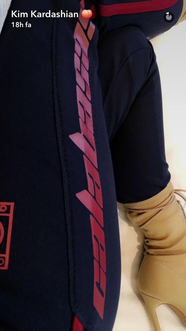 Anche Kim Kardashian ci regala uno primo sguardo alla prossima collezione del marito su Snapchat. Stavolta si tratta di Calabasas, un'immagine di un sweats blu con il nome del marchio in bordeaux.