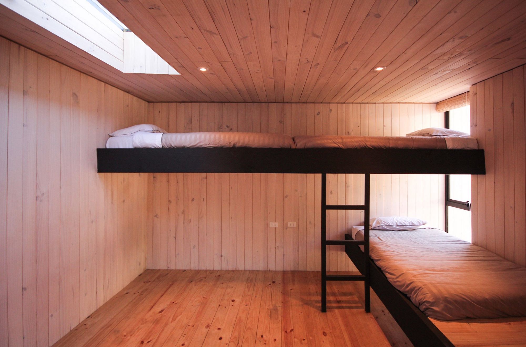 The walls and ceilings are covered with light wood boards, while the floor is covered with slightly darker boards. Black furniture that eembellishesspaces contrasts against pale surfaces. The first level is occupied by the master bedroom which through sliding glass doors leads to a terrace. A room with bunk beds occupies the other end of the floor and has two narrow windows set within protruding frames.