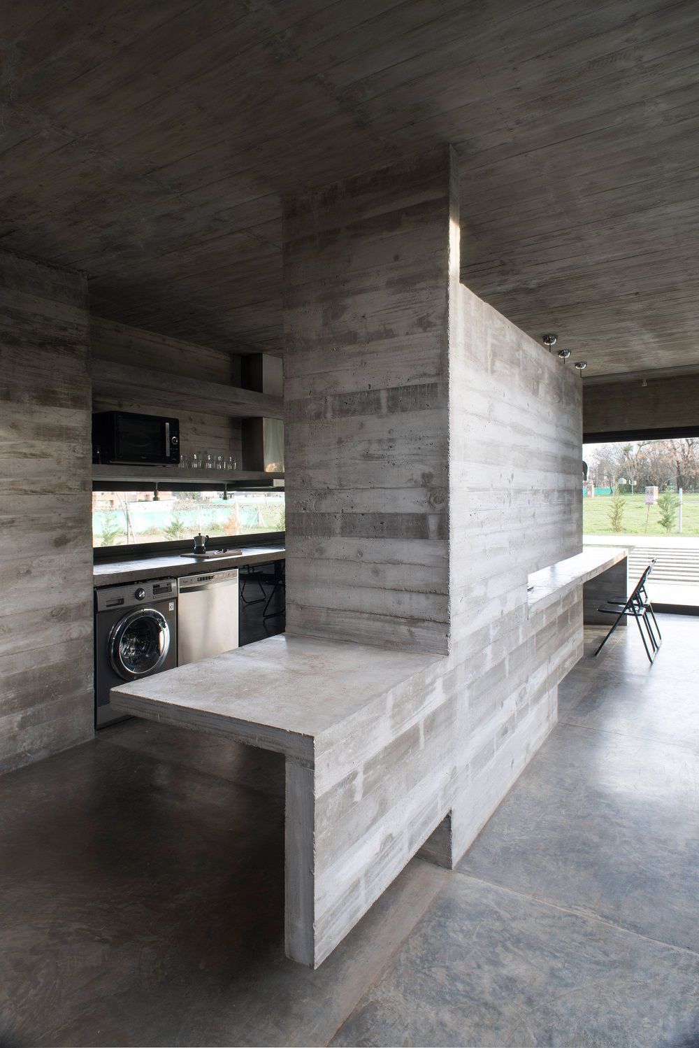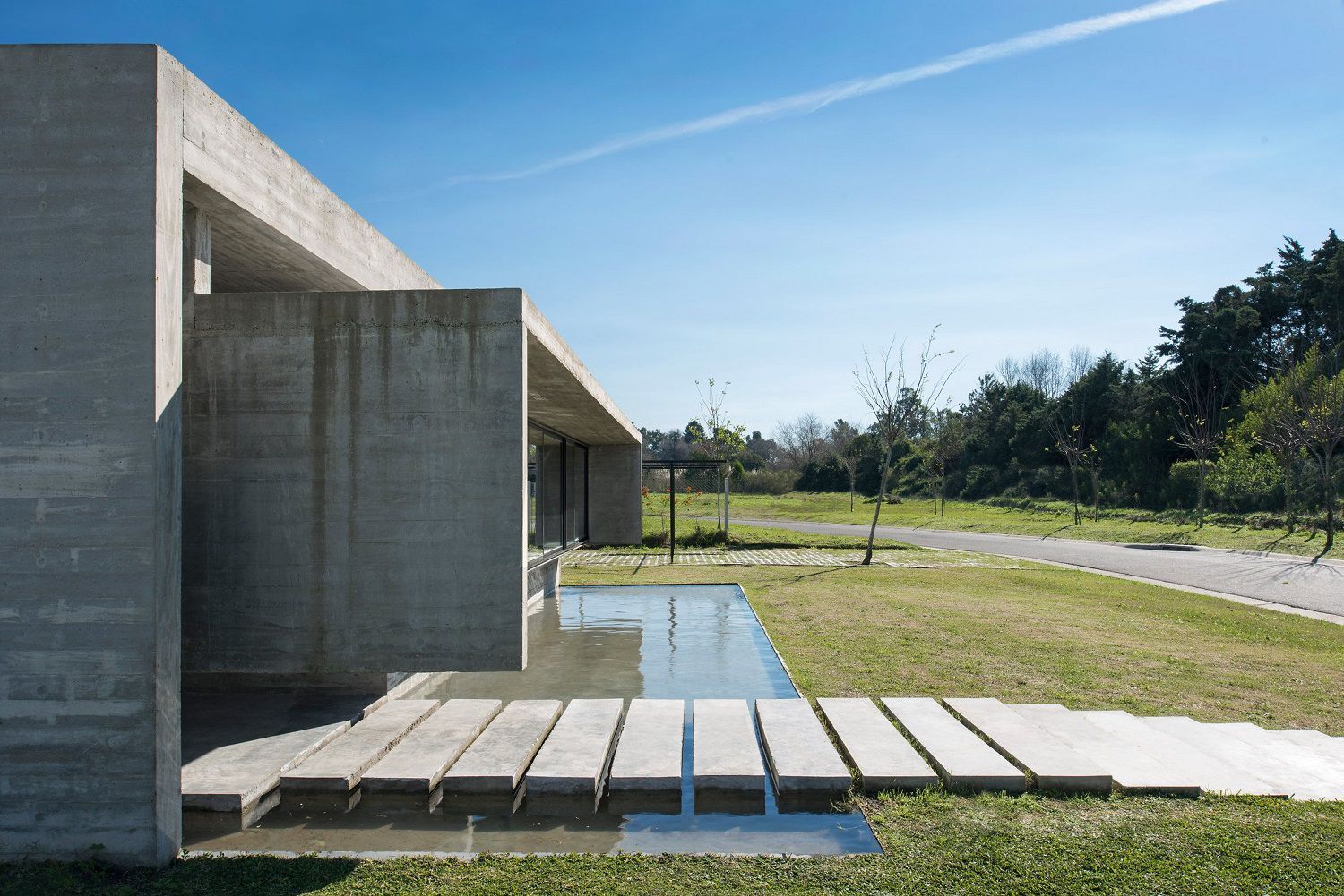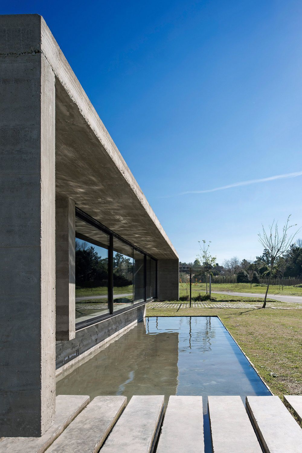 The glass and concrete casing that characterizes Casa Mach is crossed by a fascinating play of light, different lighting effects throughout the day, produced from sunlight filtering from tetto.Il draft Luciano Kruk, born from the desire of a man to have a home that reminded of the design and choice of materials the paternal one, combines clean lines, simple, almost elemental elements such as cement, sunlight and water, gaining a strong visual impact.