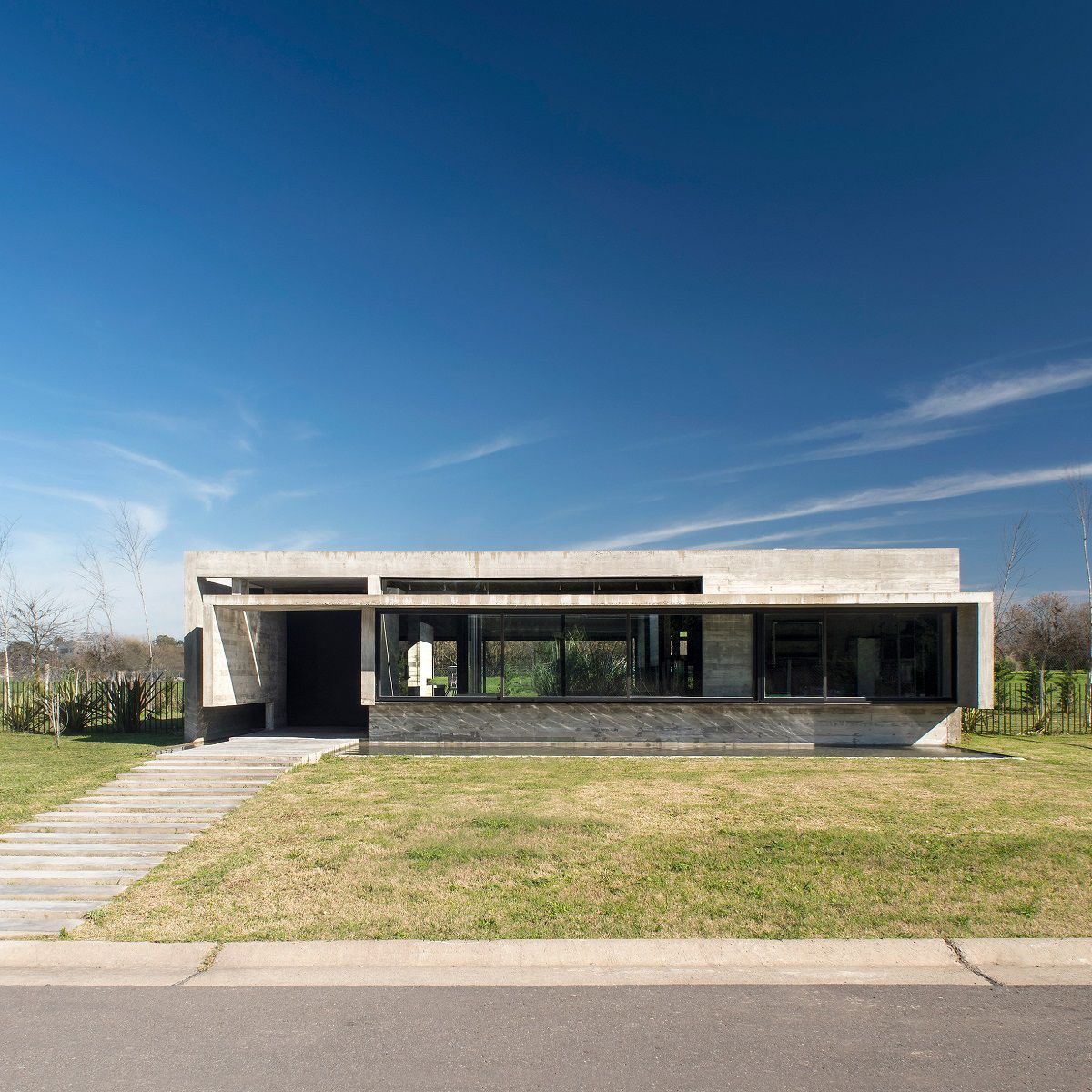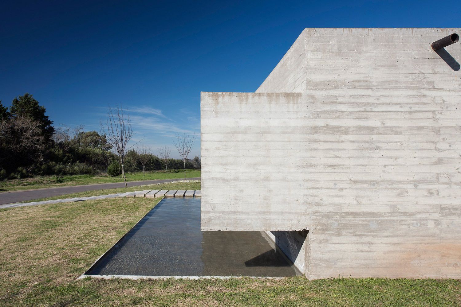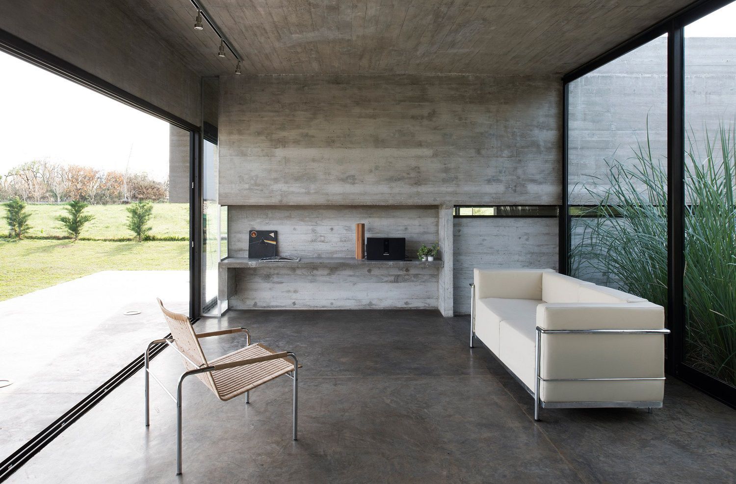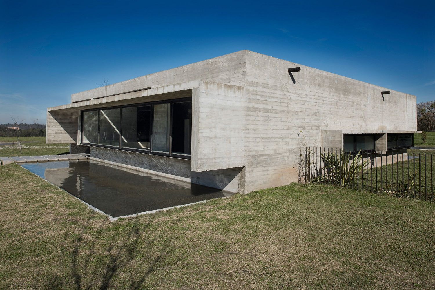 It is a 142 sqm fully constructed concrete building, a quadrilateral consisting of two almost blind walls and two other walls occupied by huge transparent windows that visually connect the exterior garden and the central patio. In fact on the front of the villa stands a small a reflecting pool crossed by a runner, while on the back there is the real green heart of the place: a pool and a large garden surrounded by a grove.