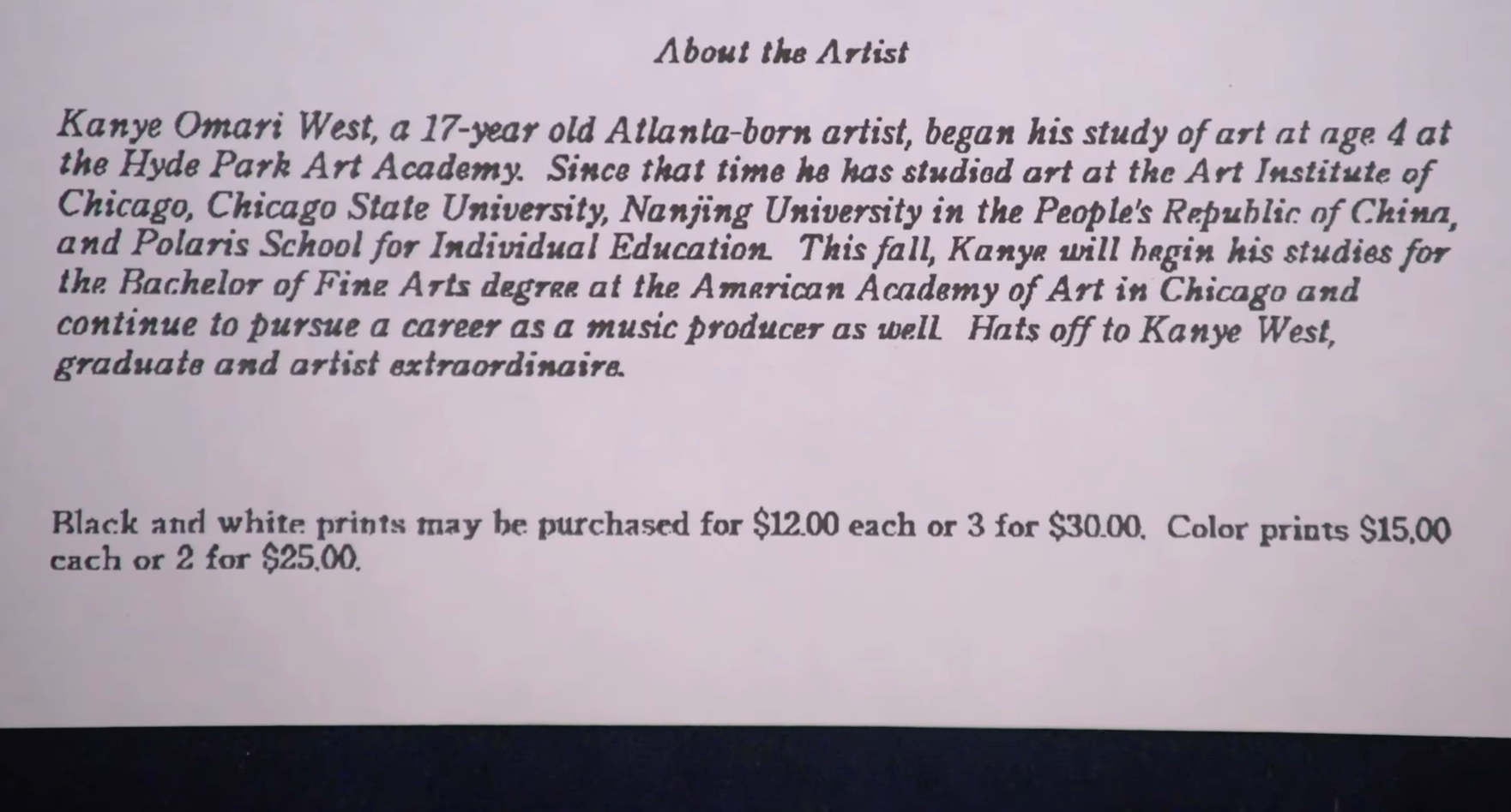 Among the other curiosities shown during the episode of Antiques Roadshow, a flyer, probably written by Kanye himself, appeared, retracing his artistic education on the occasion of his first exhibition in high school. The prices of the works indicated in the flyer were between 12 and 30 euros, now those same works are worth up to 8000 euros per piece.