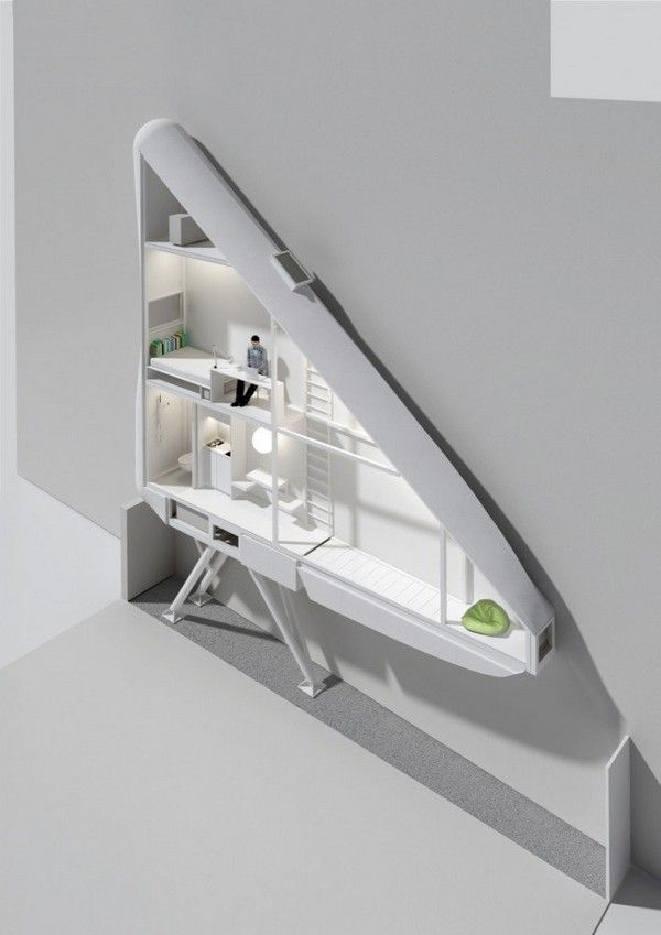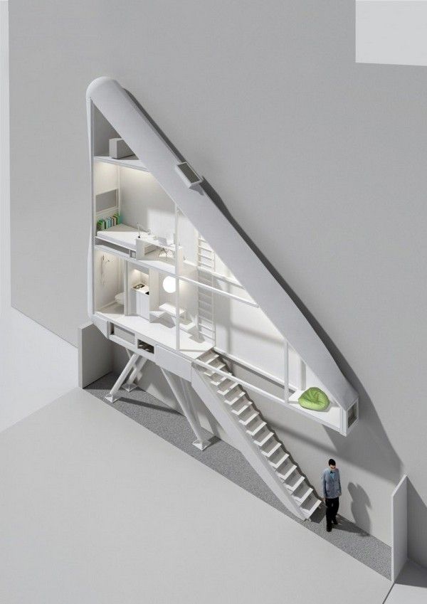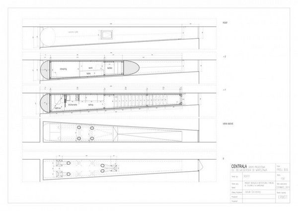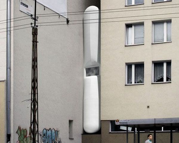 Built in an elevated, small alley space the Keret House will measure between 122 centimeters and 72 centimeters at the most narrow points in the interior. Overall the dwelling spans about 14.5 square meters, which is rather spacious all things considered. The residence is being created for Etgar Keret, who believes that the tight corridors will provide for an excellent work space. The home will reside between two buildings on 22 ChÅ?odna Street and 74 Å»elazna Street in the district of Wola, Poland.