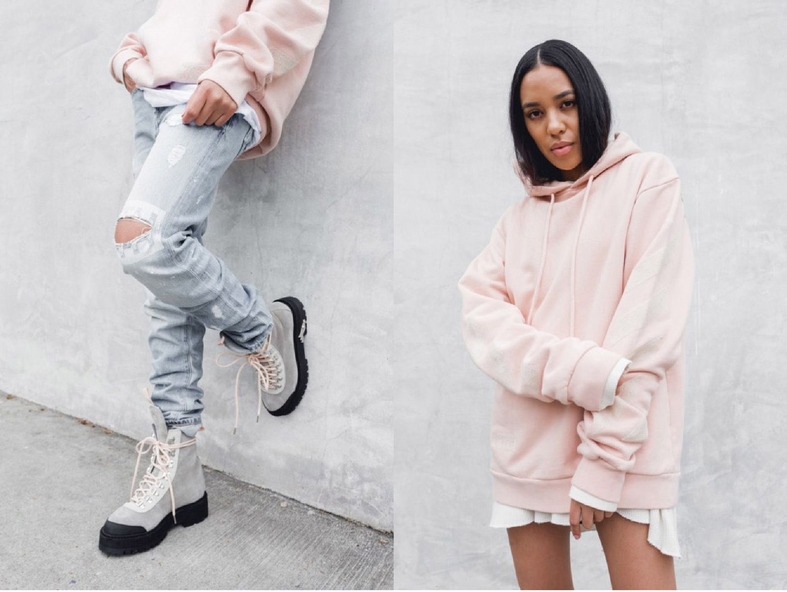 The result is a series of pieces unisex: hoodies, jersey crewnecks and tees and a pair of gray suede hiking boots with black accents and pink, hand made in Italy in limited numbers (20 pairs).
