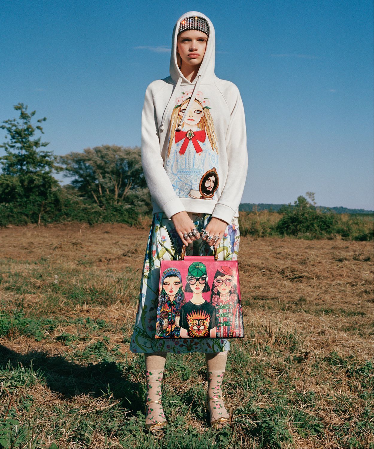 Since then, the artist link with the house has become increasingly tight until it flows now in a capsule exclusive collection which includes 40 elements among clothing, shoes like Princetown slippers and Ace sneakers, handbags like the GG Marmont and shopper with bamboo handles, silk articles and accessories on which are depicted the works of Unskilled Worker.