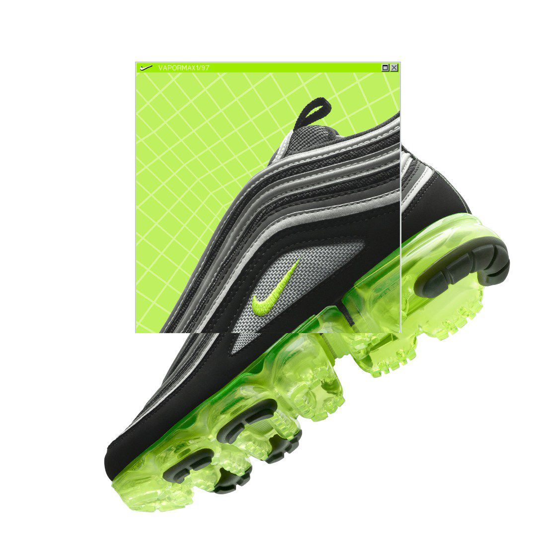 Silhouettes inspired by bullet trains, combines the Air Max 97 upper with the revolutionary Air-Sole unit with full length of Air VaporMax. The result is a brand new hypercool combo.