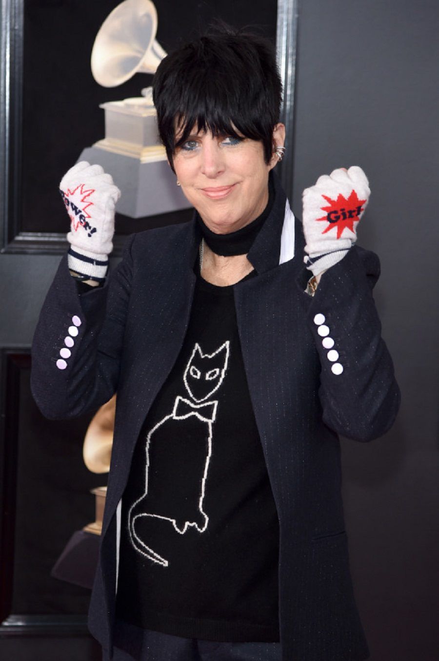 The noted American composer, the creative mind of Aerosmith's legendary song I Do not Want to Miss a Thing, she decided to show an "unconventional" look: blue suit, black sweater with a cat and "Girl-Power" gloves.