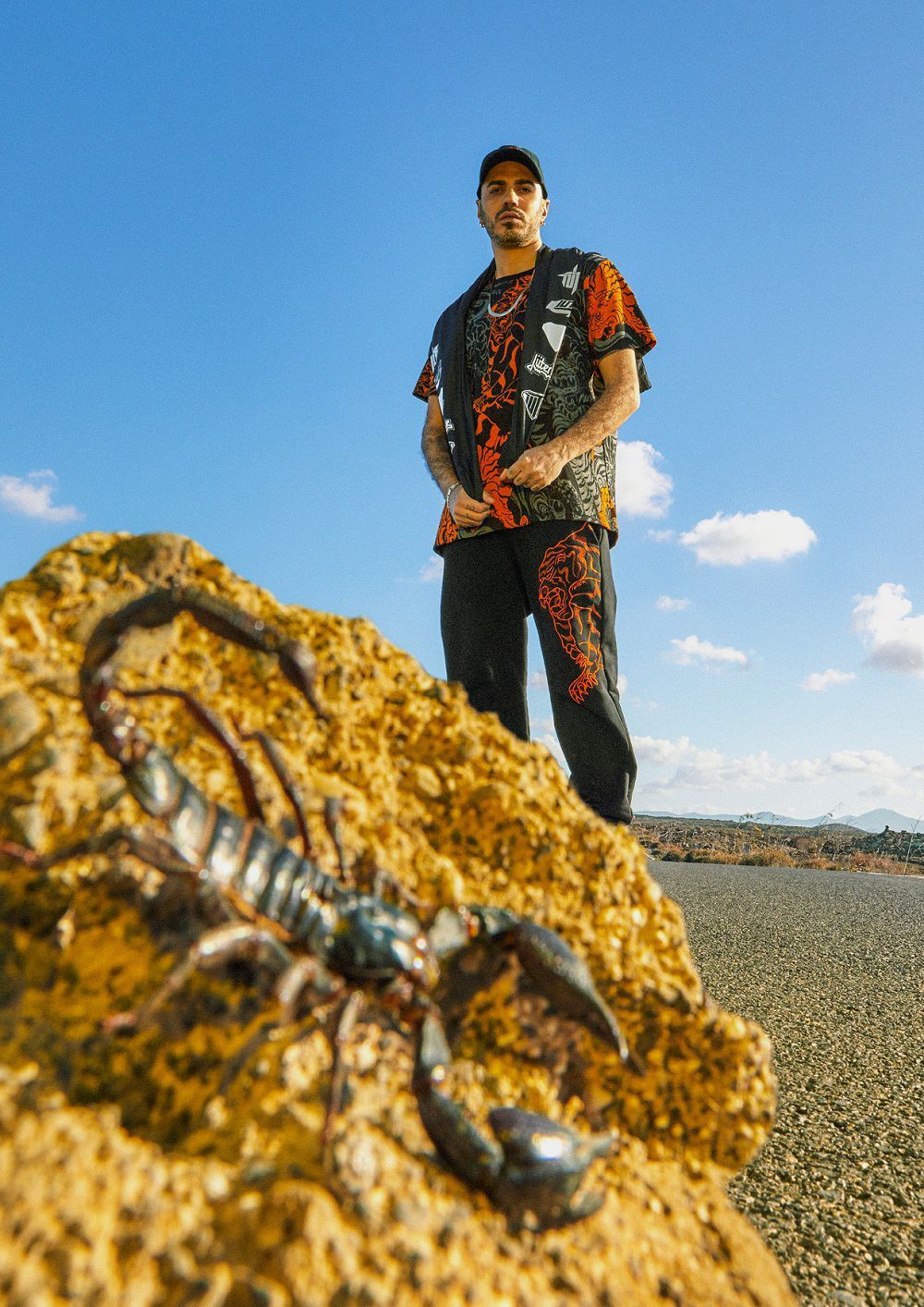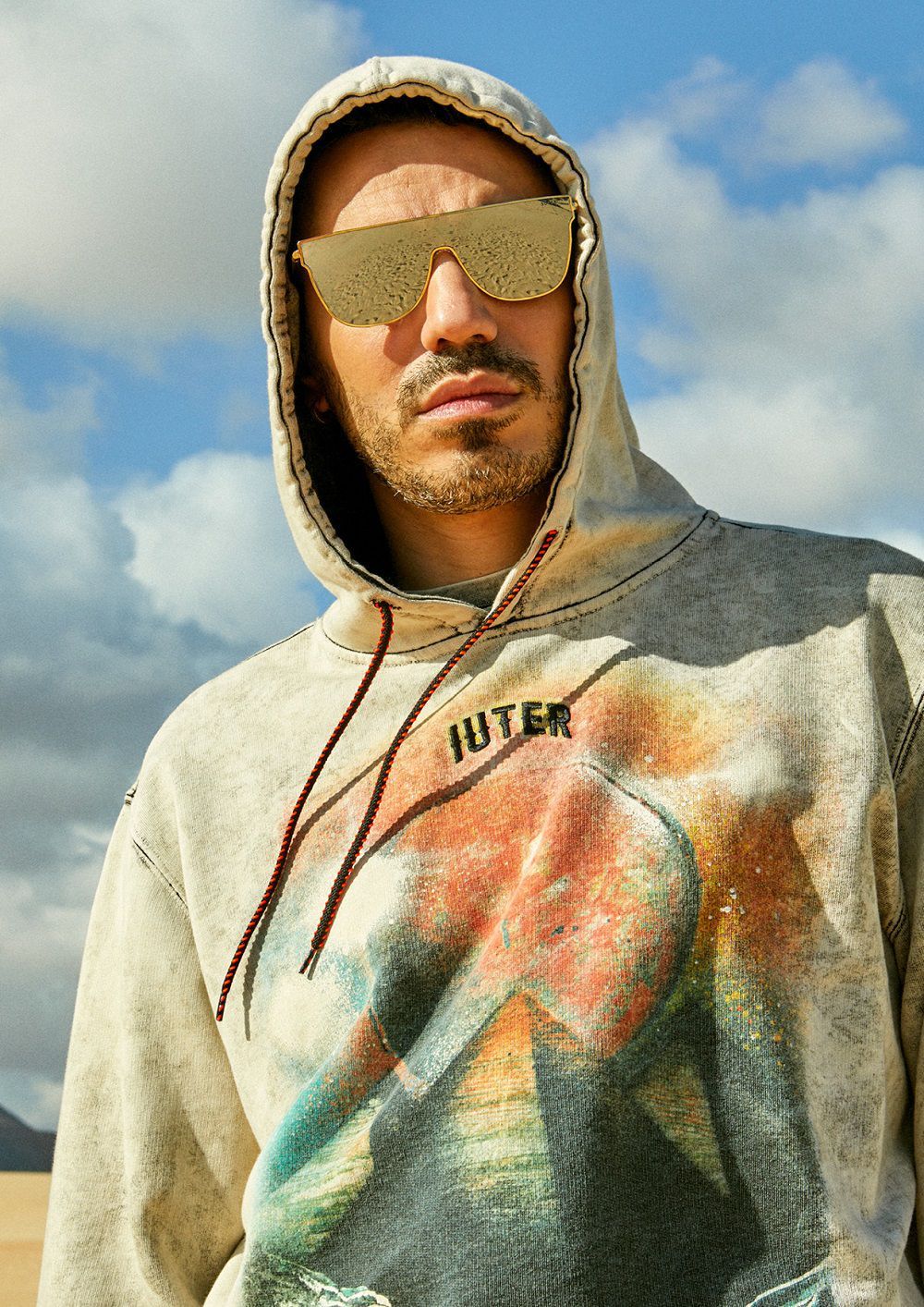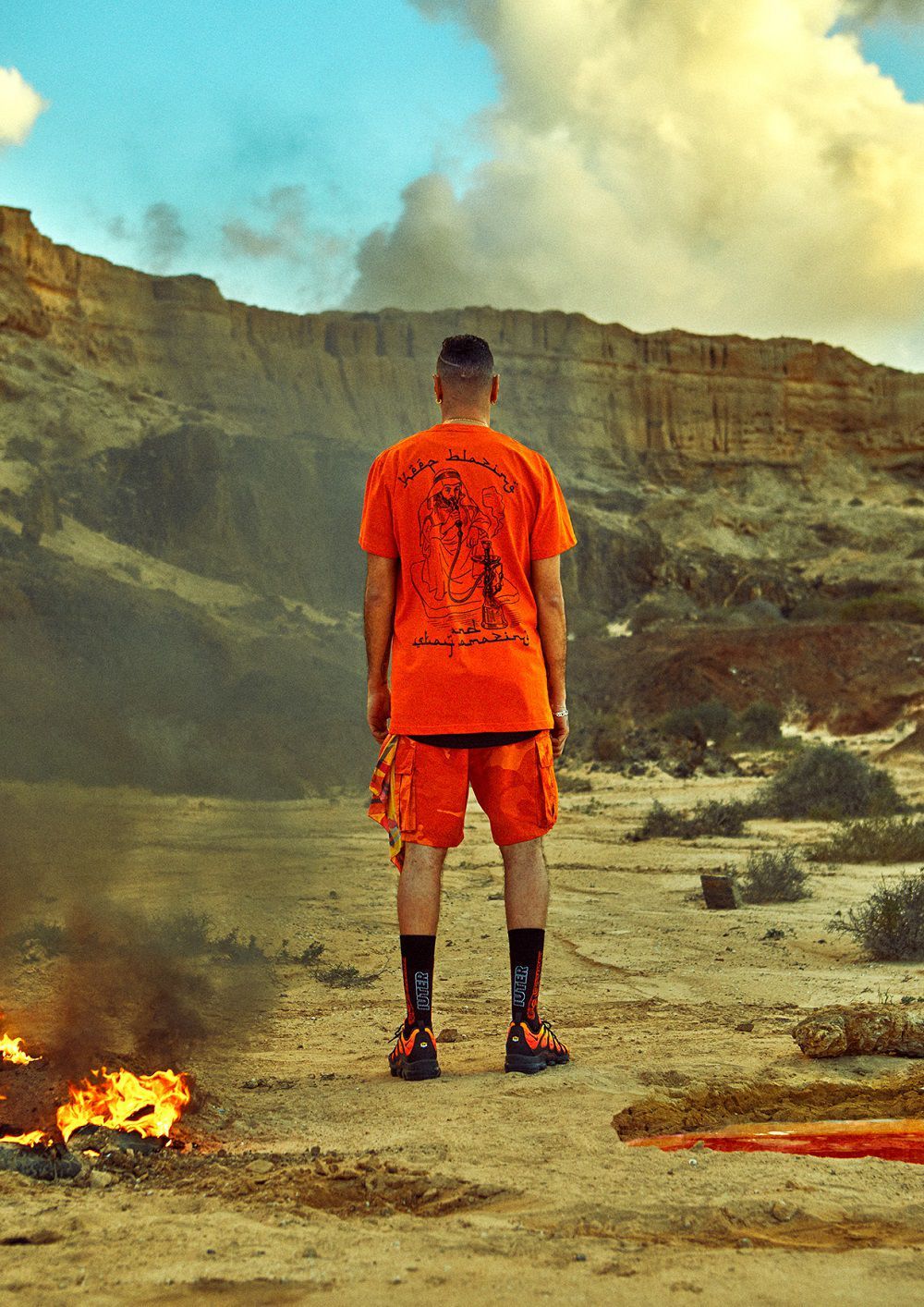 IUTER decides to celebrate isolation as a positive aspect, as a state of mind, through the new "Mirage" SS18 collection. Protagonist is the well-known Italian rapper Marracash, a figure that once again confirms his link with the brand. The desert location gives an extra touch to the garments, immersing them in a wild atmosphere, in perfect connection with the fil rouge of the items. Cobra, snakes, scorpions, flames, are images that recur permanently, accompanied by strong colors such as orange, which is reminiscent of Safety Orange, used to make people visible in dangerous situations. Different types of camouflage, a design that clearly calls streetwear style and Marracash characterized by his strong spirit of revenge.