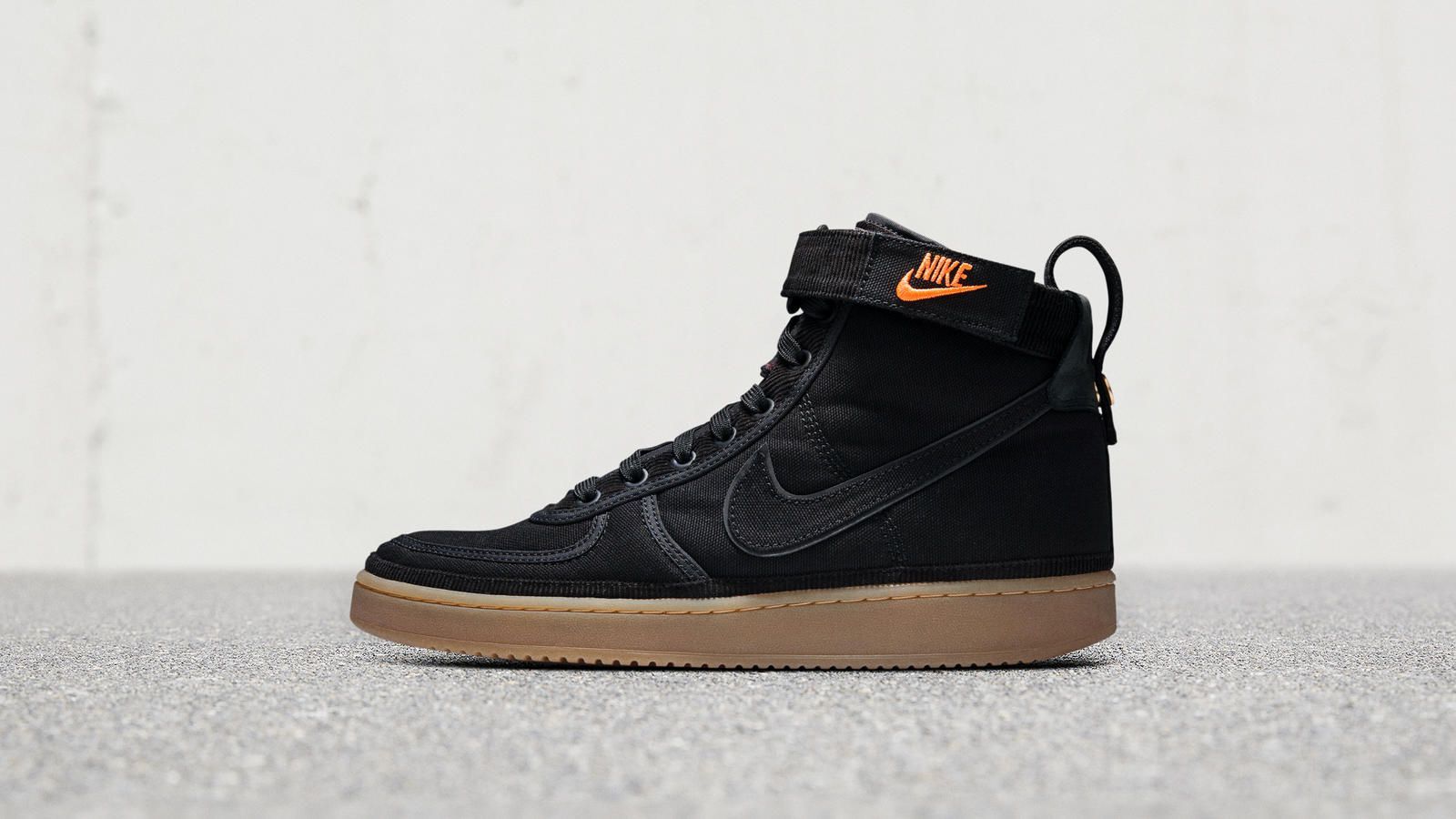 Made of black Dearborn canvas and corduroy, reflective details applied to the contour of the Swoosh. The original basketball silhouette features an adjustable ankle strap and interior padding on the heel inspired by the inner wool lining of the Carhartt WIP Michigan Chore lining. As with all the four sneakers of this collaboration, the label on the left tongue is decorated with the Nike logo while the right side has the classic "C" from Carhartt WIP.