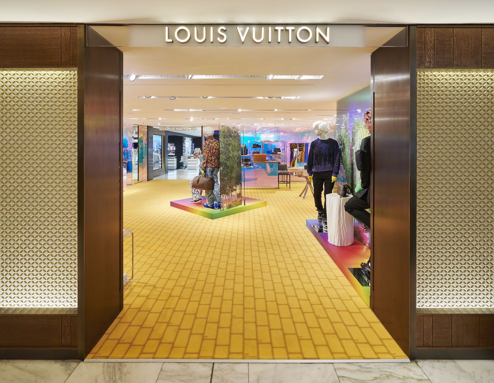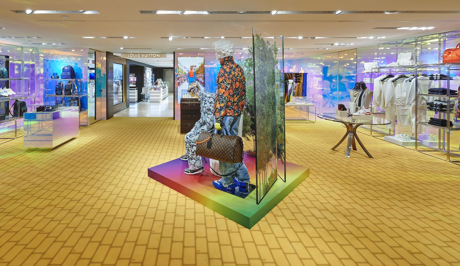 The walls inside are covered by iridescent tones and the new Rainbow Monogram, converging towards a print inspired by the imaginary world of Dorothy, creating the illusion of being immersed in a thick forest of evergreens, flowering with ruby-red poppies. On the soft carpet floor, decorated with a brick print, the Golden path leads the visitor directly to the center of the shop. Here a new rug created specifically for this concept, in materials and colors that differ from one another, were created with the features and postures of the real-life models that took part in the Virgil Abloh fashion show during the summer.