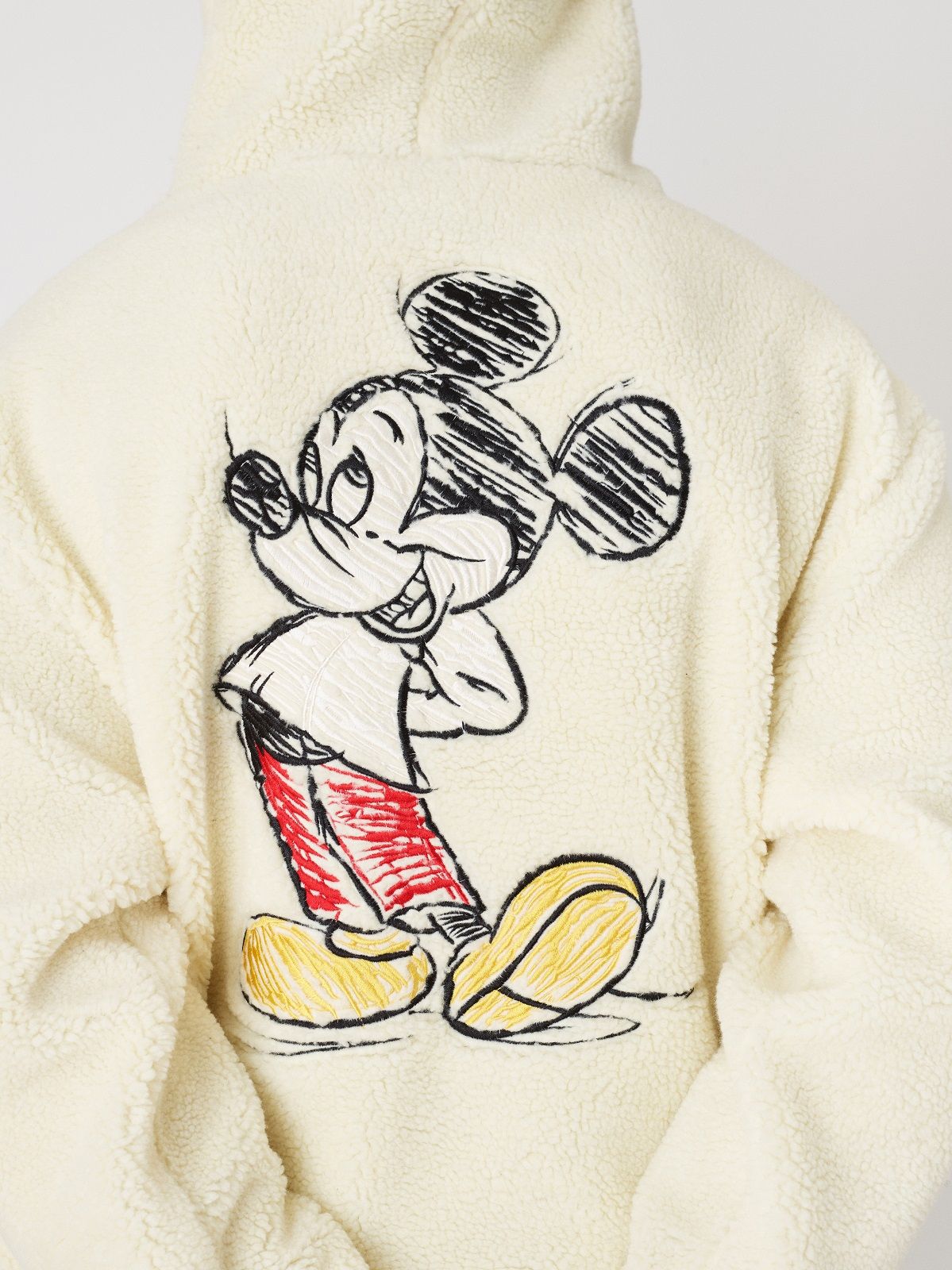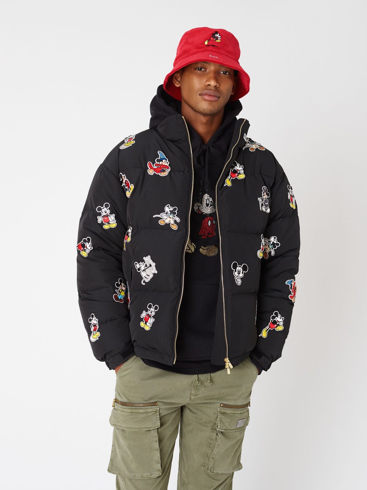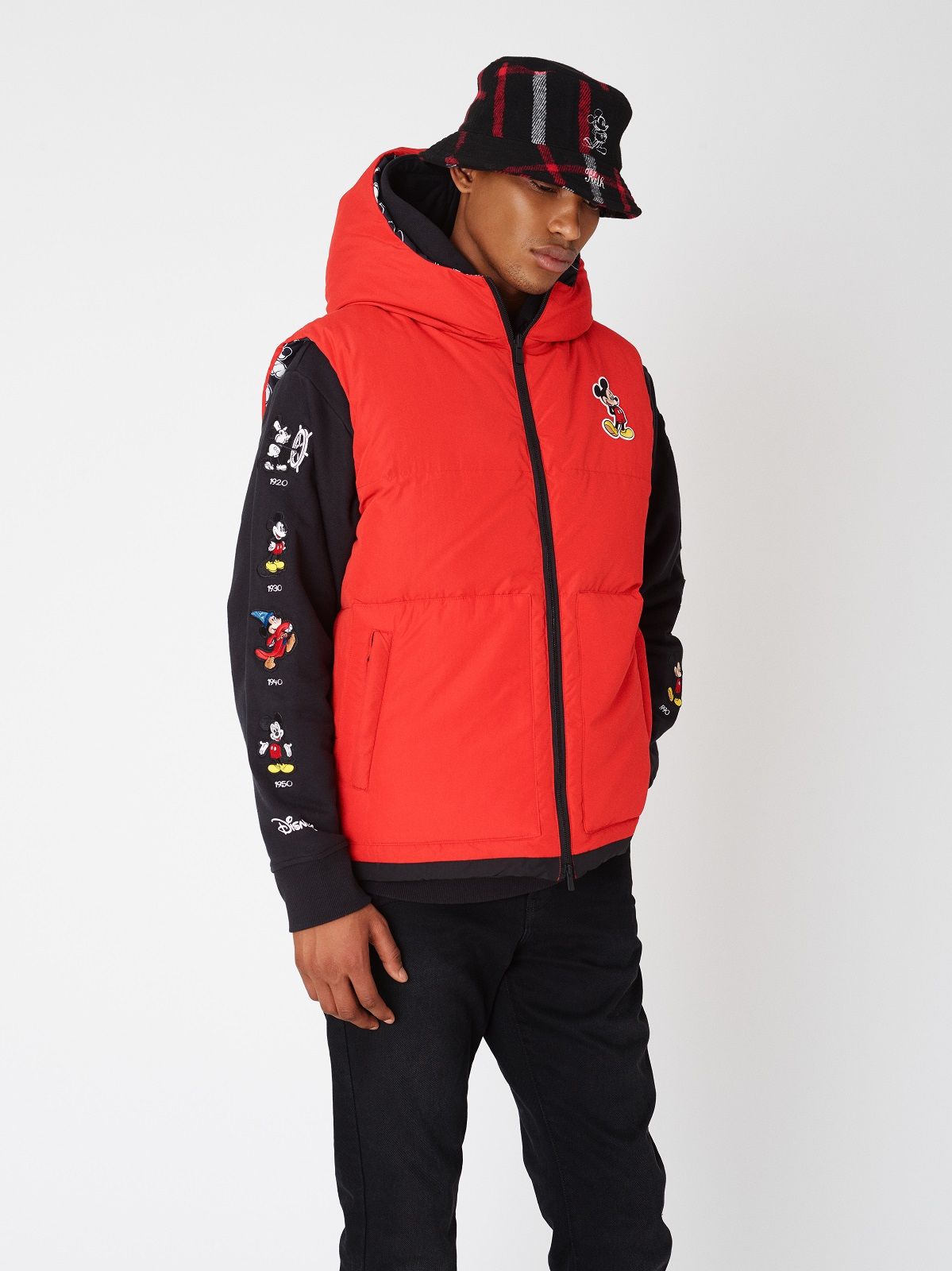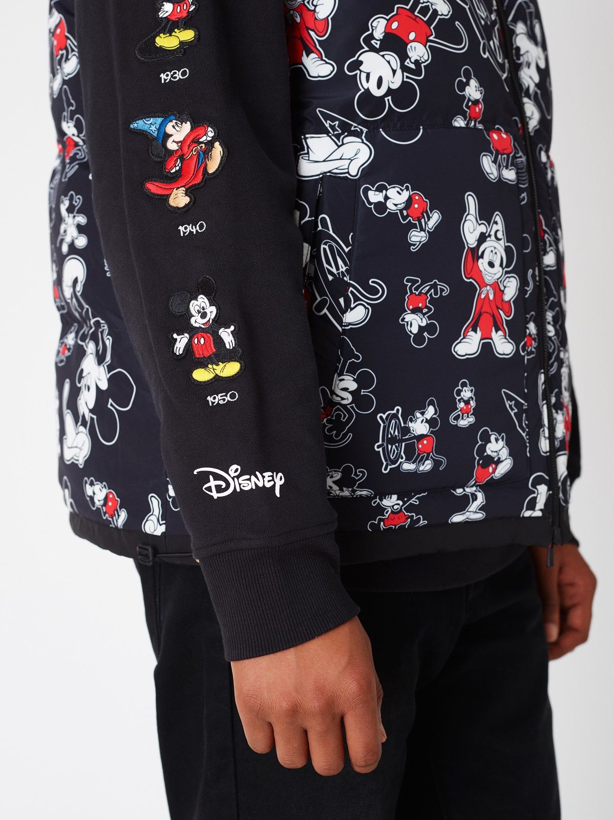 The Mickey Mouse of the 1920s is associated with denim and the sportiest silhouettes: hoodies, trucker jackets and denim kimonos on which the image of the Disney character is embroidered or made with Swarowski crystals. For the 1930s, corduroy rugby jerseys and varsity jackets were chosen. Wool knitwear represents Mickey Mouse as the Sorcerer's Apprentice in 1940s Fantasia. The flannel and striped rippling fabrics are the protagonists of the sections dedicated to the 50s and 60s respectively. The Mickey Mouse of the 70s is paired with the fleece and the one of the 80s the twill. Finally, for the 1990s, a line of puffer jackets was chosen.