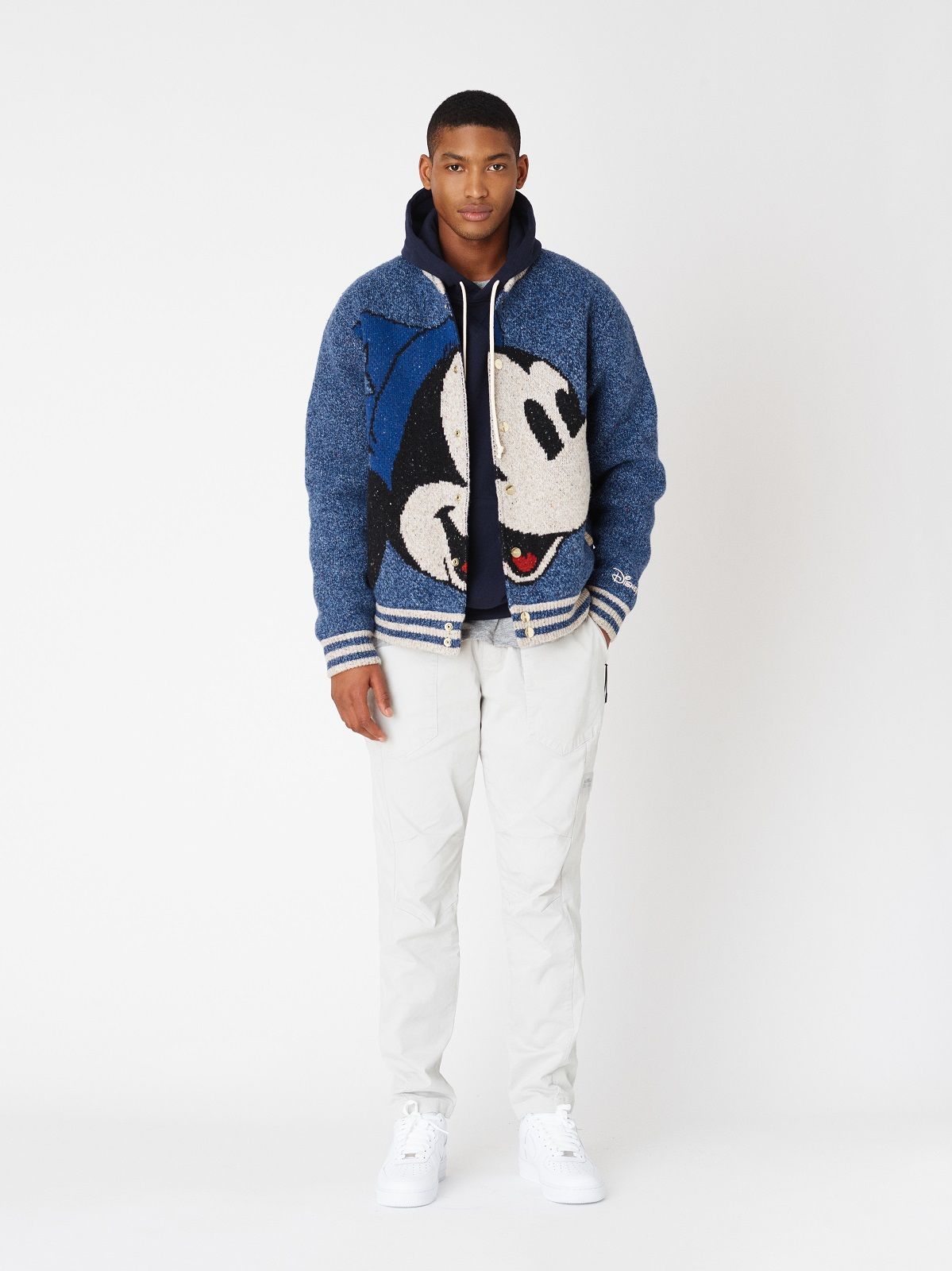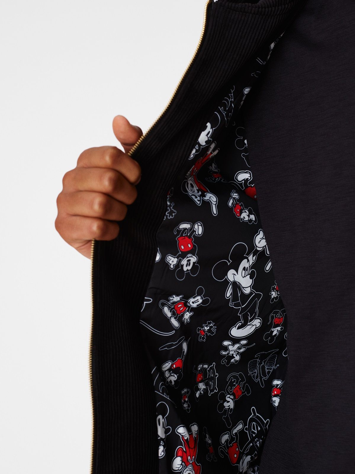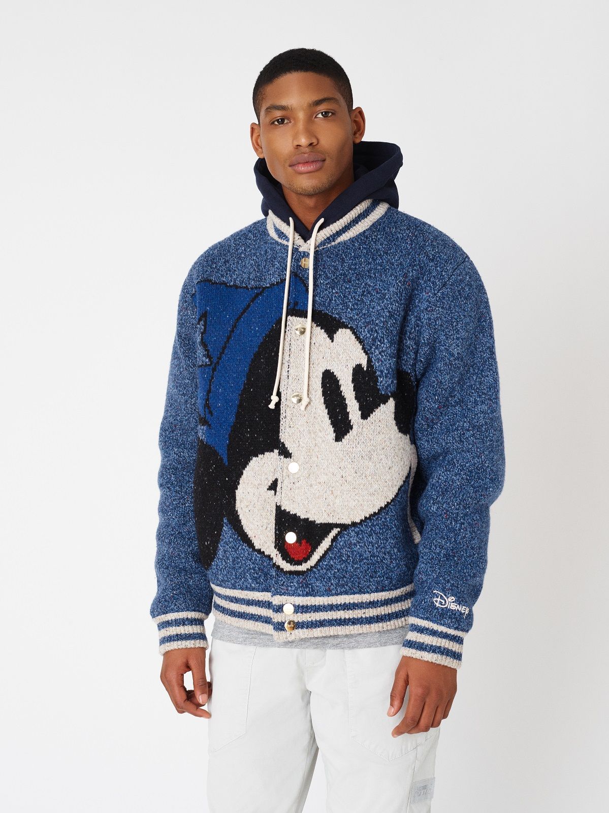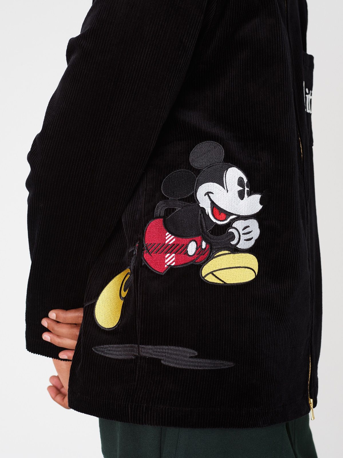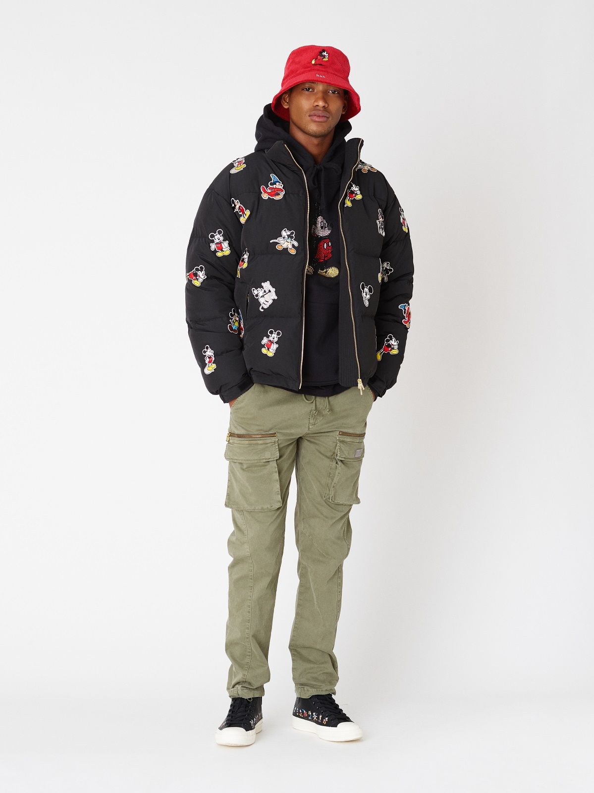 The Mickey Mouse of the 1920s is associated with denim and the sportiest silhouettes: hoodies, trucker jackets and denim kimonos on which the image of the Disney character is embroidered or made with Swarowski crystals. For the 1930s, corduroy rugby jerseys and varsity jackets were chosen. Wool knitwear represents Mickey Mouse as the Sorcerer's Apprentice in 1940s Fantasia. The flannel and striped rippling fabrics are the protagonists of the sections dedicated to the 50s and 60s respectively. The Mickey Mouse of the 70s is paired with the fleece and the one of the 80s the twill. Finally, for the 1990s, a line of puffer jackets was chosen.