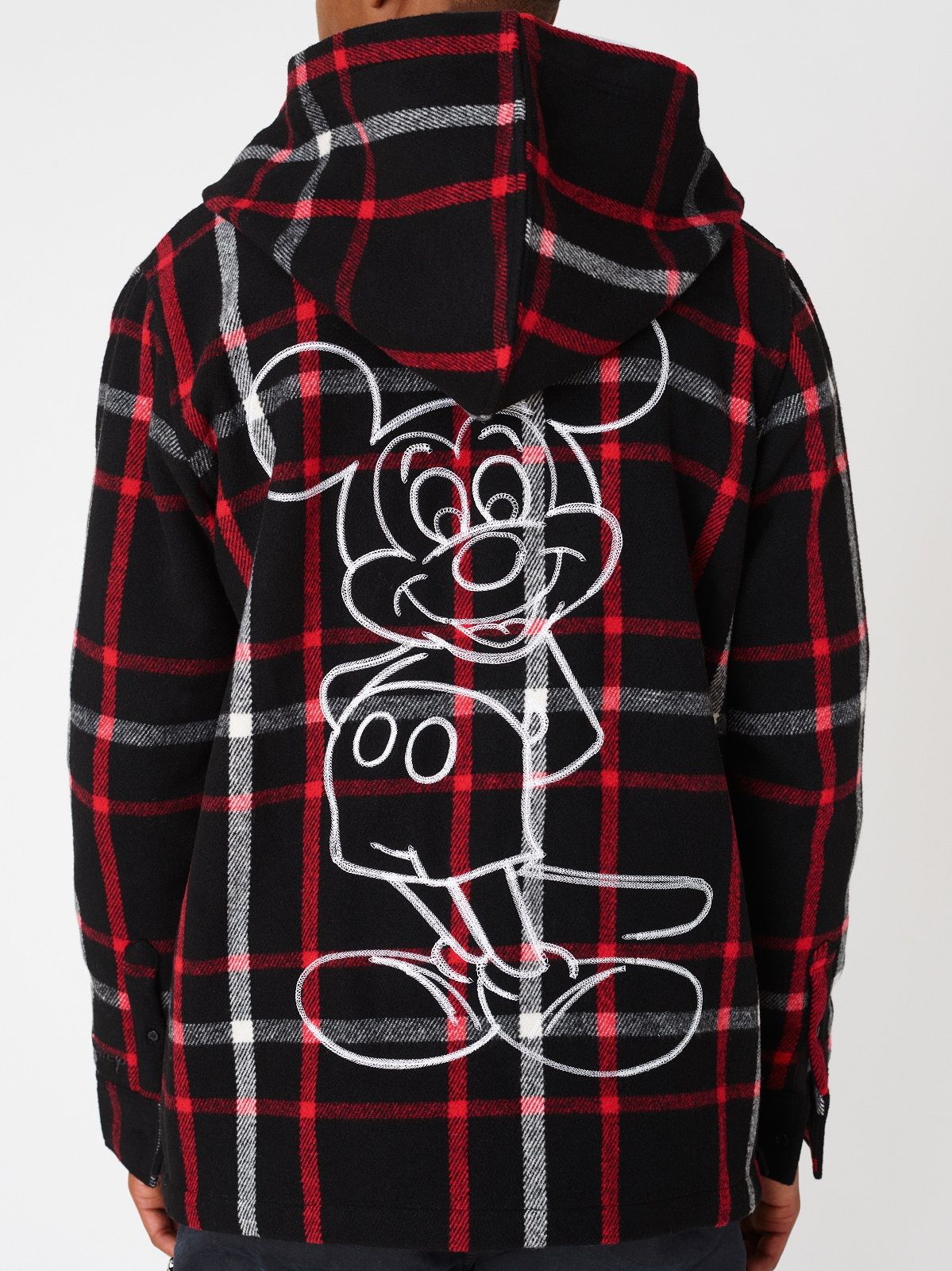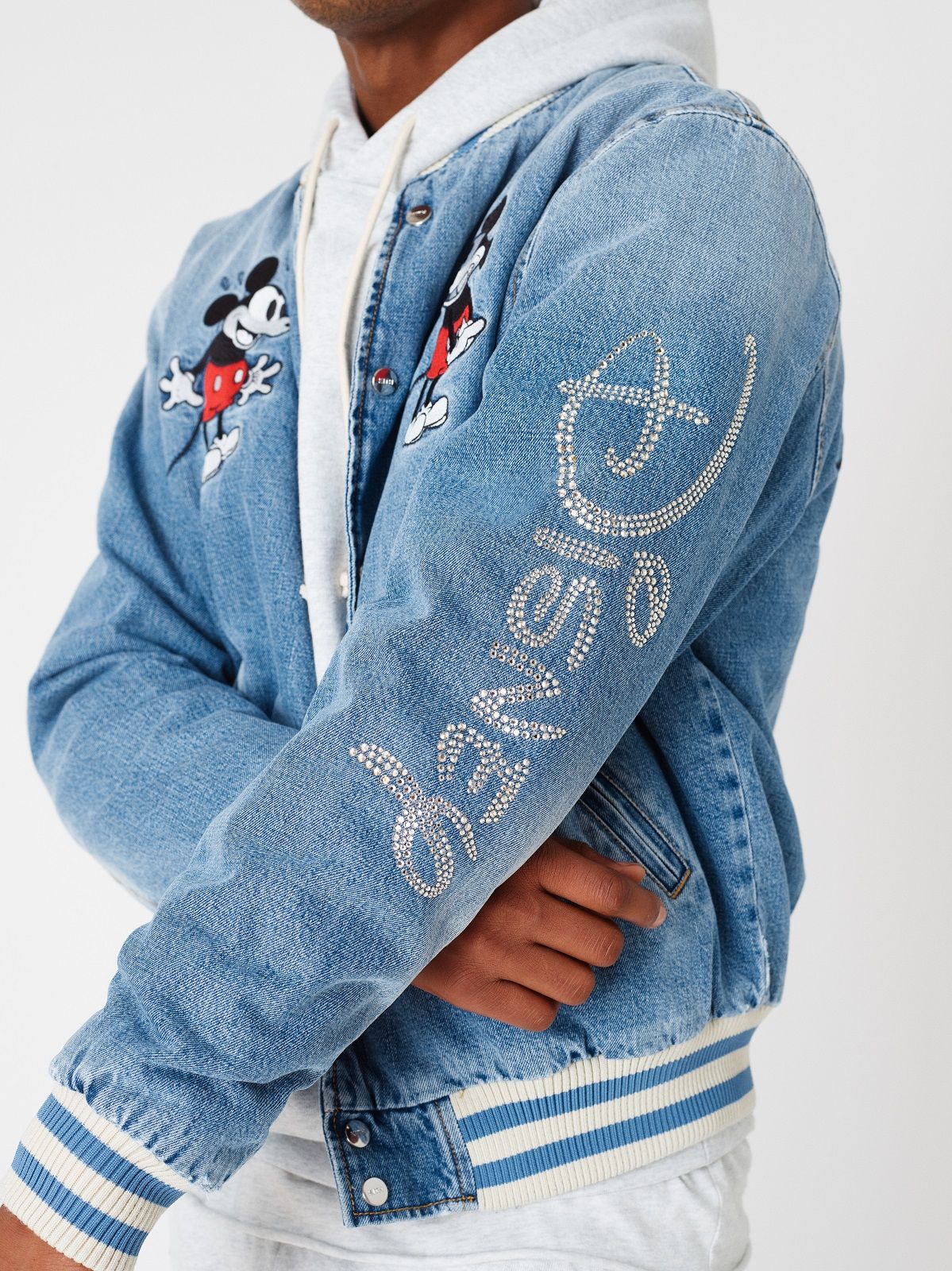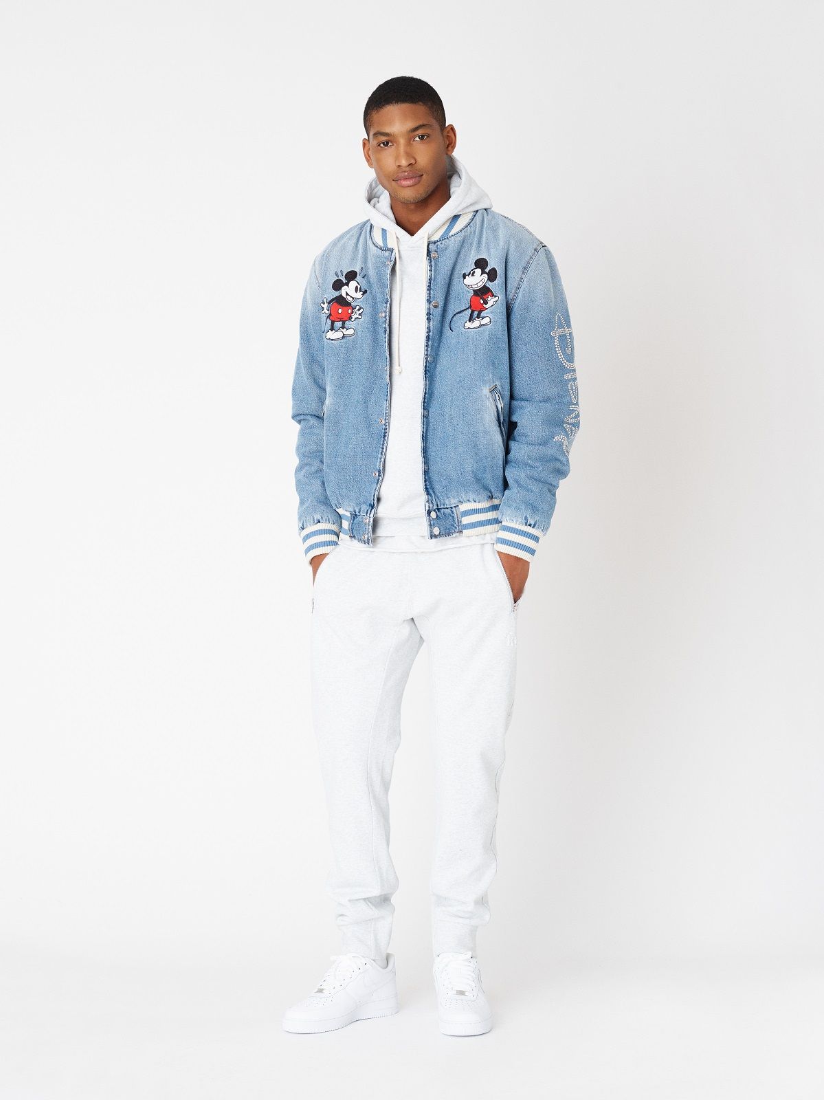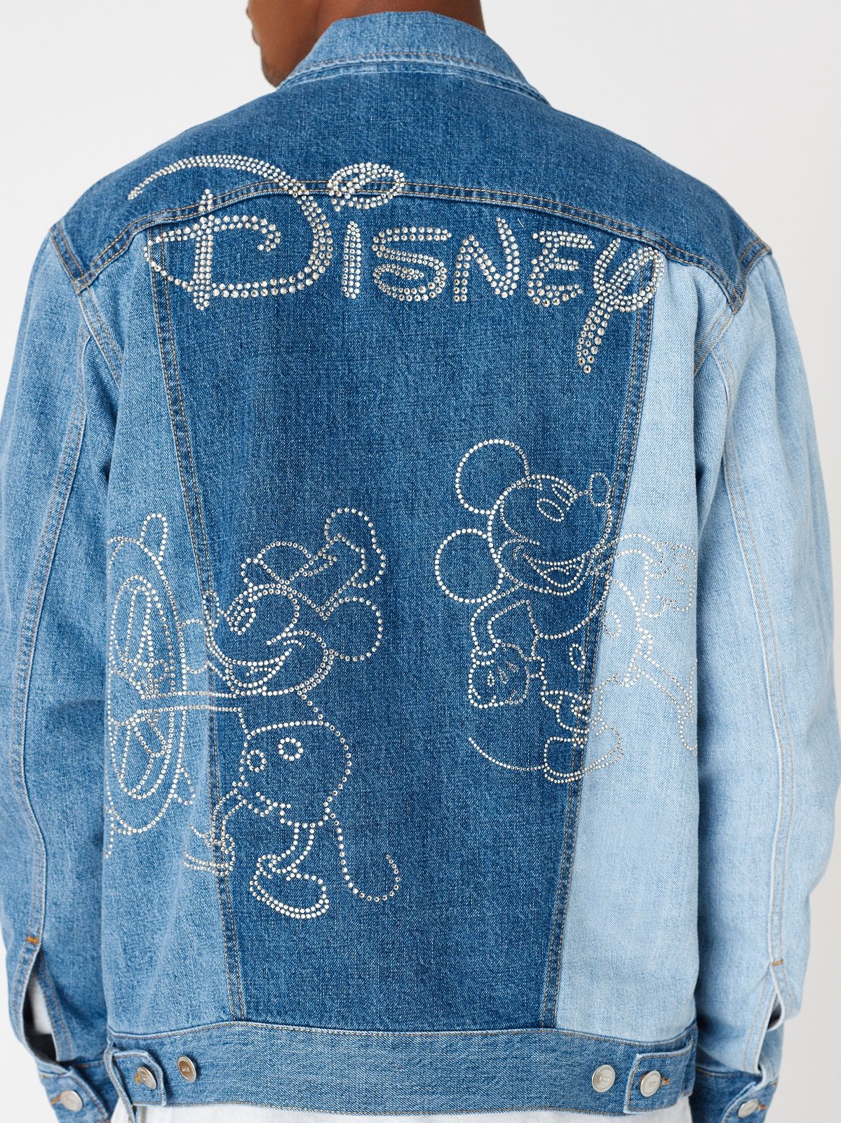 The Mickey Mouse of the 1920s is associated with denim and the sportiest silhouettes: hoodies, trucker jackets and denim kimonos on which the image of the Disney character is embroidered or made with Swarowski crystals. For the 1930s, corduroy rugby jerseys and varsity jackets were chosen. Wool knitwear represents Mickey Mouse as the Sorcerer's Apprentice in 1940s Fantasia. The flannel and striped rippling fabrics are the protagonists of the sections dedicated to the 50s and 60s respectively. The Mickey Mouse of the 70s is paired with the fleece and the one of the 80s the twill. Finally, for the 1990s, a line of puffer jackets was chosen.
