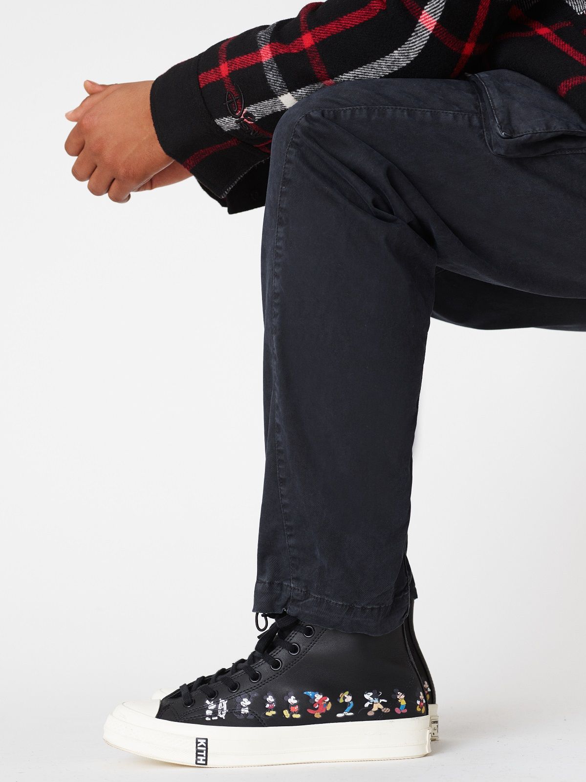To mark the 90th anniversary of Mickey Mouse's first appearance, Disney and KITH collaborated together on a capsule collection that explores and re-imagines the character's iconography through the years. Each version of the character, one per decade, has been associated with a fabric for a total of 80 items. In addition to the garments and accessories, the collection also includes three different Chuck Taylors made together with Converse and a line dedicated to children.