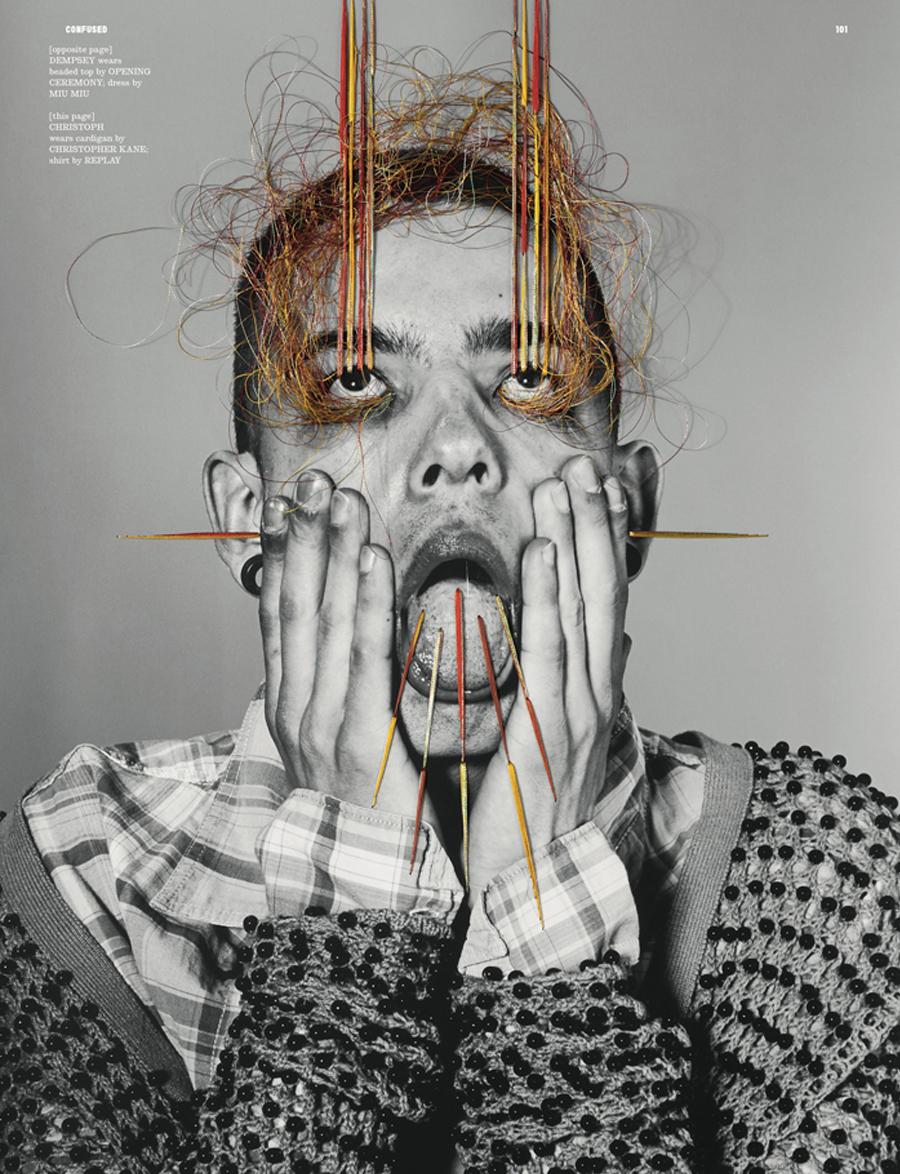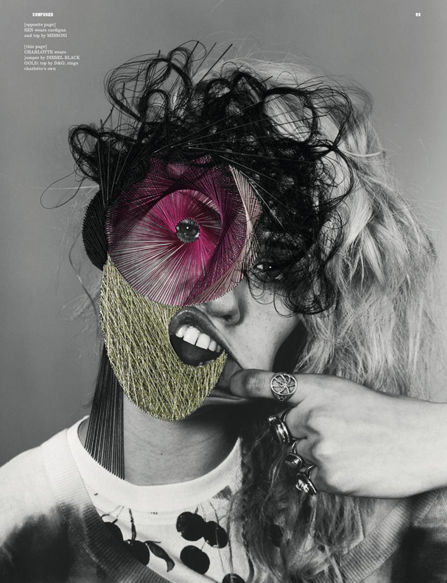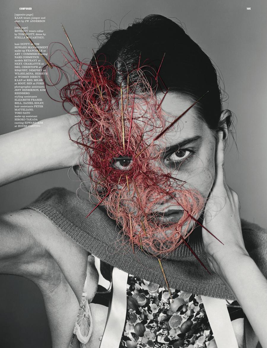 Quando la fotografia prende corpo si fa riferimento a Richard Burdridge. E un esempio lampante il servizio di Dazed&Confused dove la staticità di una foto in bianco e nero prende vita attraverso fibre tessili applcate ad arte.