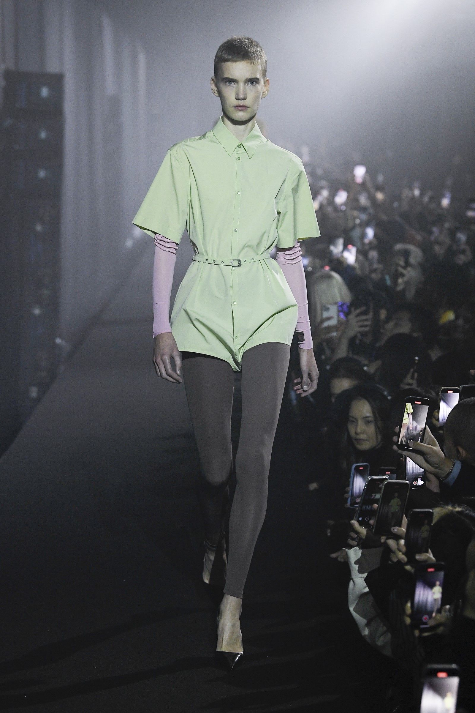 The insistent presence of leggings that replace pants in many instances recall a club culture daughter of that 2000s indie sleaze that, through Simons' alienating and nostalgic lens, further simplifies and minimizes looks. And while the combination of leggings and mesh tops recalls the party uniform of Y2K club culture, with the neon colors winking at the rave world; on the other, an anarchic sense of bon ton emerges in the overlap of shirt and wool sweater that, at the bottom hem, extends into a flap of wool reminiscent of an unfastened bodysuit - later, sleeveless sweaters appear to be worn inside out and backwards, with the Raf Simons label sitting just below the collar on the front. The collection, which opens with three skimpy, semi-transparent looks, then closes with the severity and dryness of gray wool coats and suits, beneath which, beyond the leggings, naked bodies can be perceived - these are the two sides of the radical simplicity sought by Simons: on the one hand, the anarchy of extreme reduction of clothes to second skin and color, on the other, the almost abstract dryness of a tradition beneath which a life can be felt pulsing.