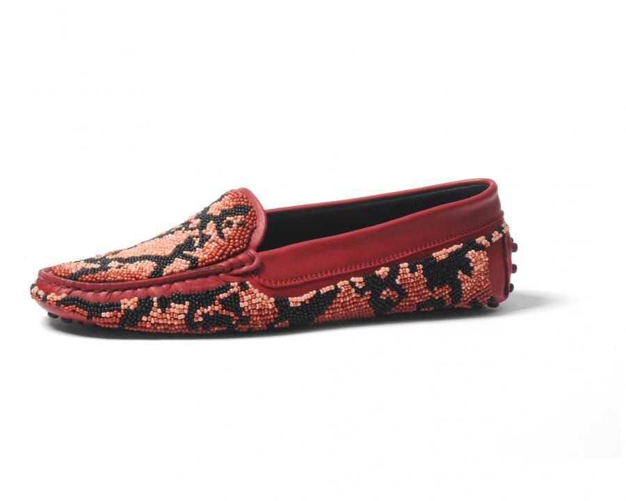 L’iconico Gommino Tod’s per la Primavera-Estate 2012 si veste di morbide pelli naturali, arricchite da ricami in seta impreziositi da paillettes e borchie color oro e argento o perline che creano un particolare effetto pitone. Il risultato è esclusivo e funzionale allo stesso tempo, una calzatura speciale realizzata in tiratura limitata che esalta la creatività italiana e l’arte dell’artigianalità di Tod’s.