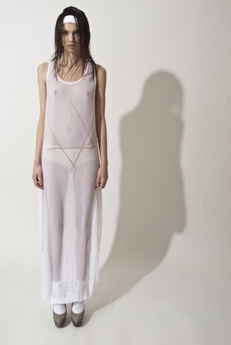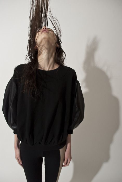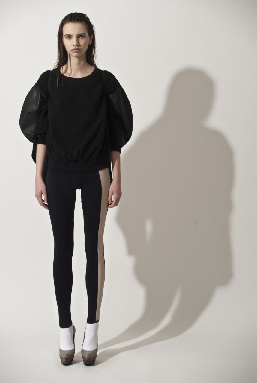 The fabrics chosen (sometimes accompanied by faux leather inserts) are sweatshirt, and jersey, lisle and Maco, in a palette of colors ranging from blacks, grays and flesh-colored, as the common base, up to occasional blues, greens, and whites.