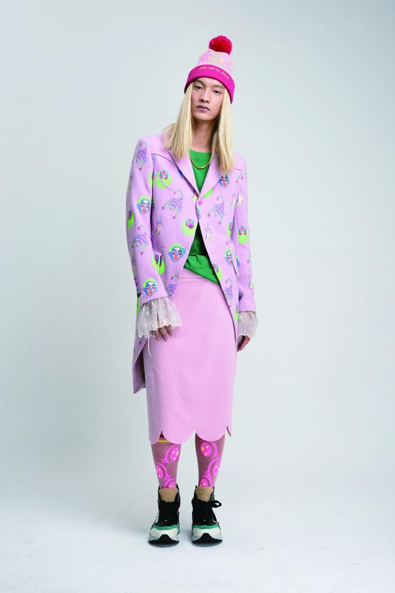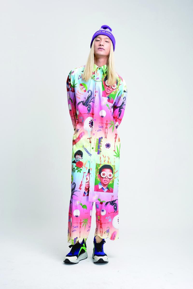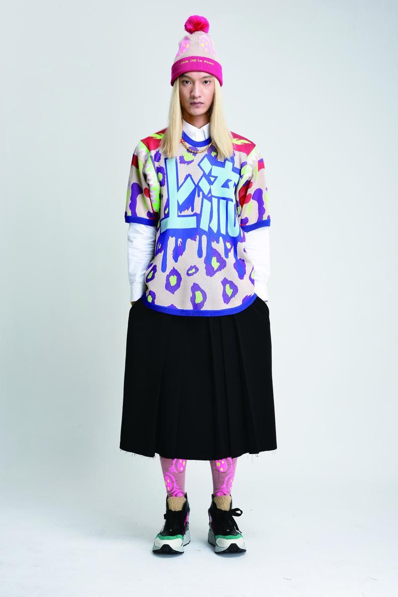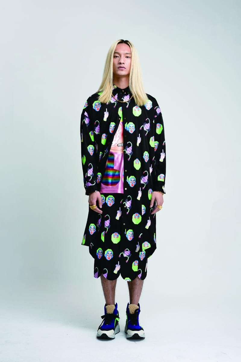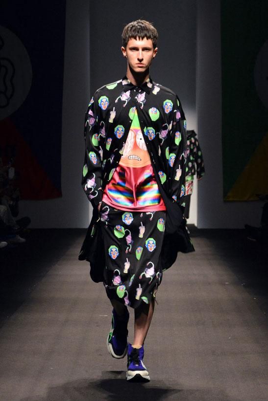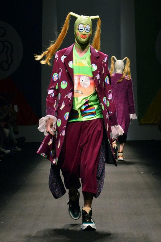 It's an homage to the cartoons, South Park, manga and pop culture. Each piece is an explosion of color, irreverent illustrations, aliens, eyeballs and fluorescent scorpions. It' s a mix'n match of motifs, influences, blazers and jackets are combined with skirts and wide trousers, western elements and Eastern forms. Sankuanz is a brand that knows how to attract attention to itself, remaining faithful to its madness.