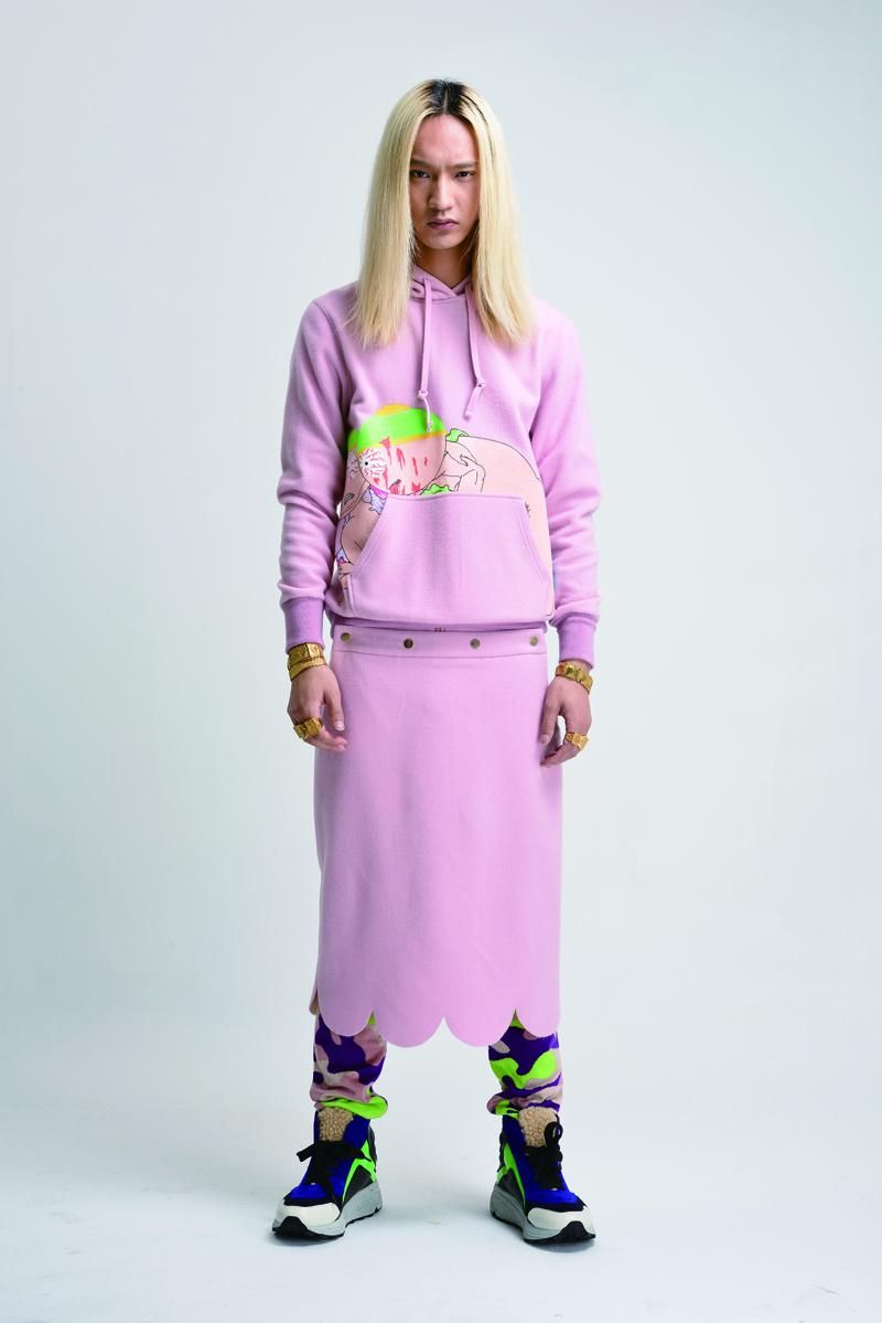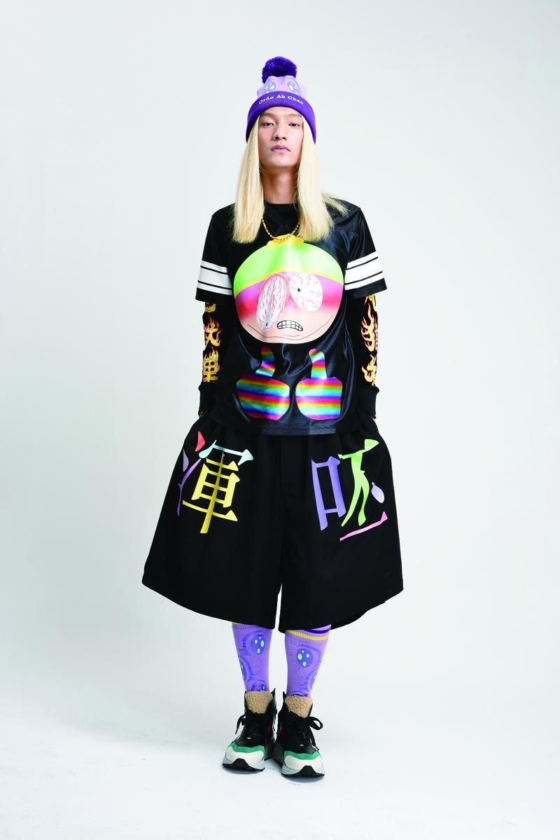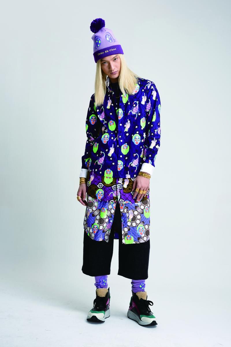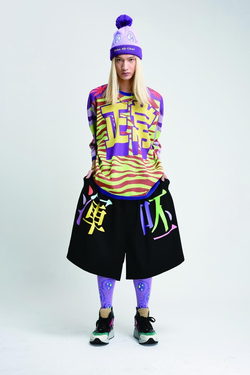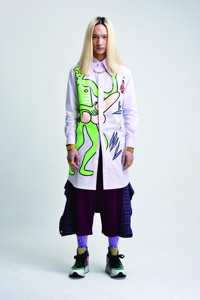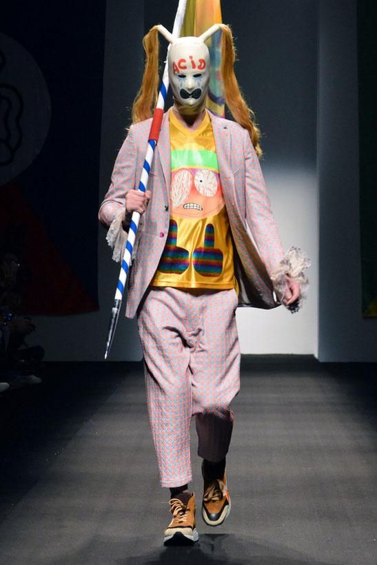It's an homage to the cartoons, South Park, manga and pop culture. Each piece is an explosion of color, irreverent illustrations, aliens, eyeballs and fluorescent scorpions. It' s a mix'n match of motifs, influences, blazers and jackets are combined with skirts and wide trousers, western elements and Eastern forms. Sankuanz is a brand that knows how to attract attention to itself, remaining faithful to its madness.