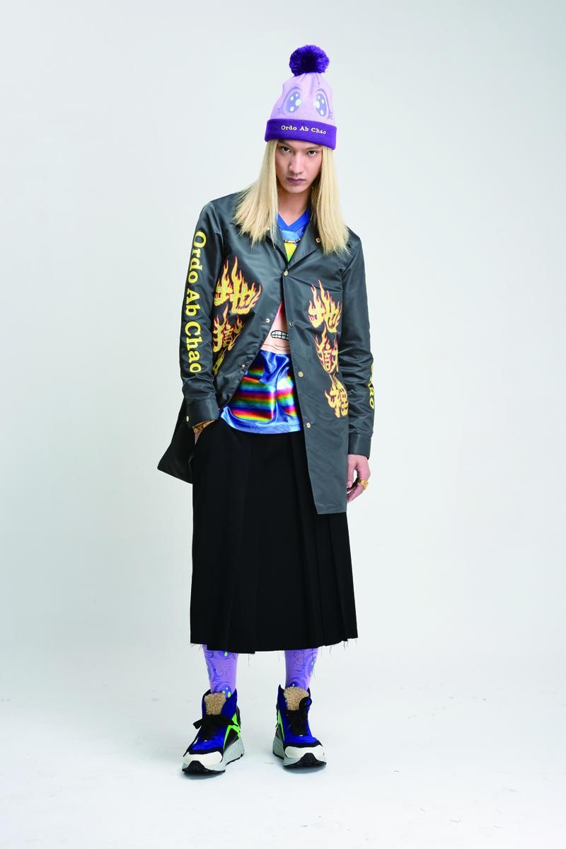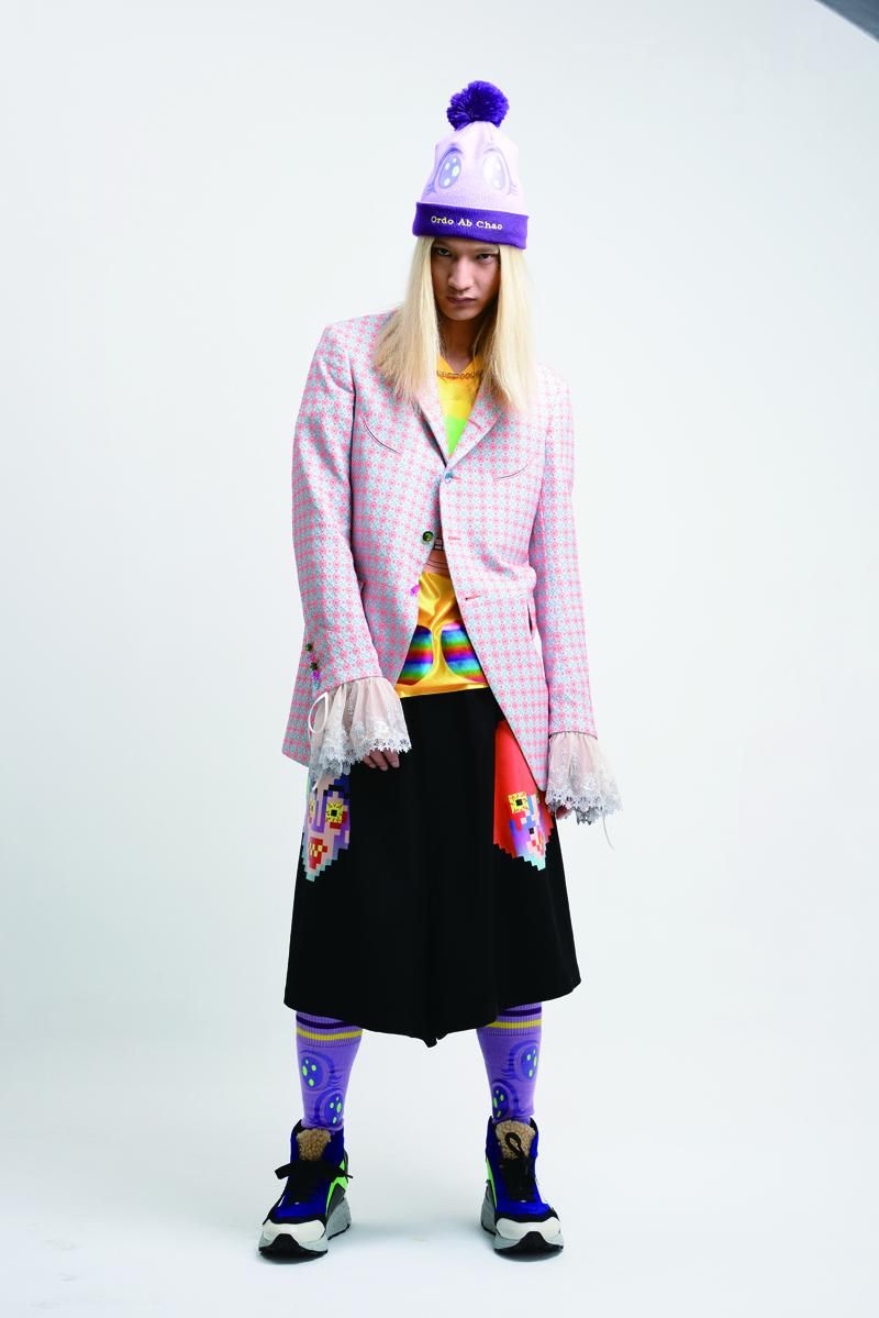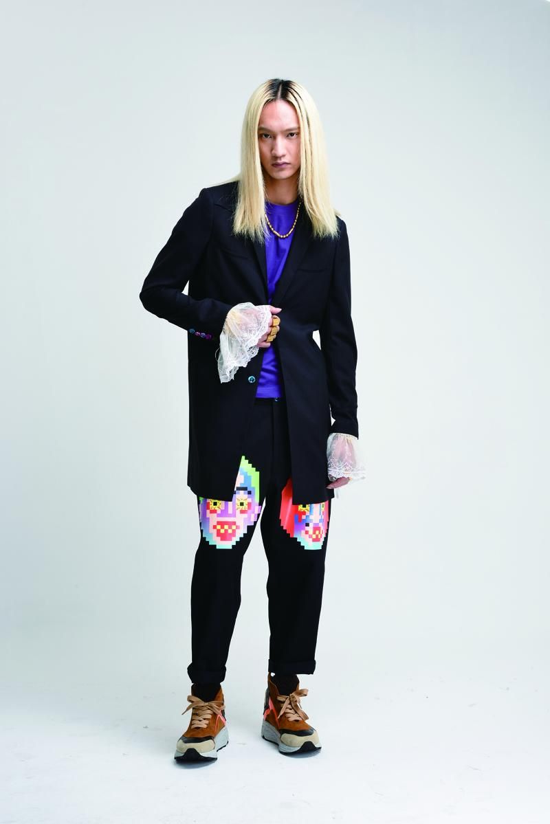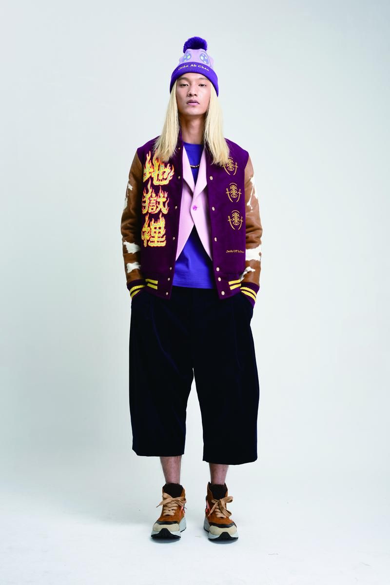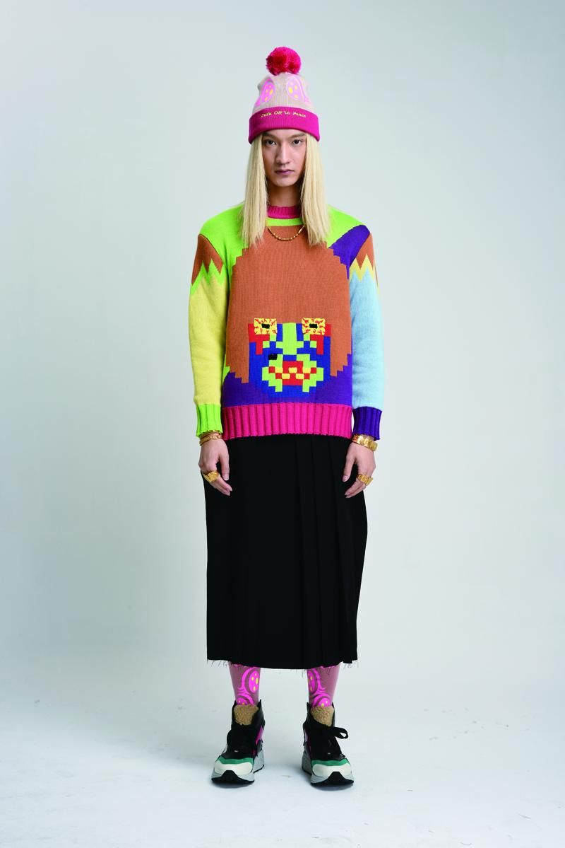 It's an homage to the cartoons, South Park, manga and pop culture. Each piece is an explosion of color, irreverent illustrations, aliens, eyeballs and fluorescent scorpions. It' s a mix'n match of motifs, influences, blazers and jackets are combined with skirts and wide trousers, western elements and Eastern forms. Sankuanz is a brand that knows how to attract attention to itself, remaining faithful to its madness.