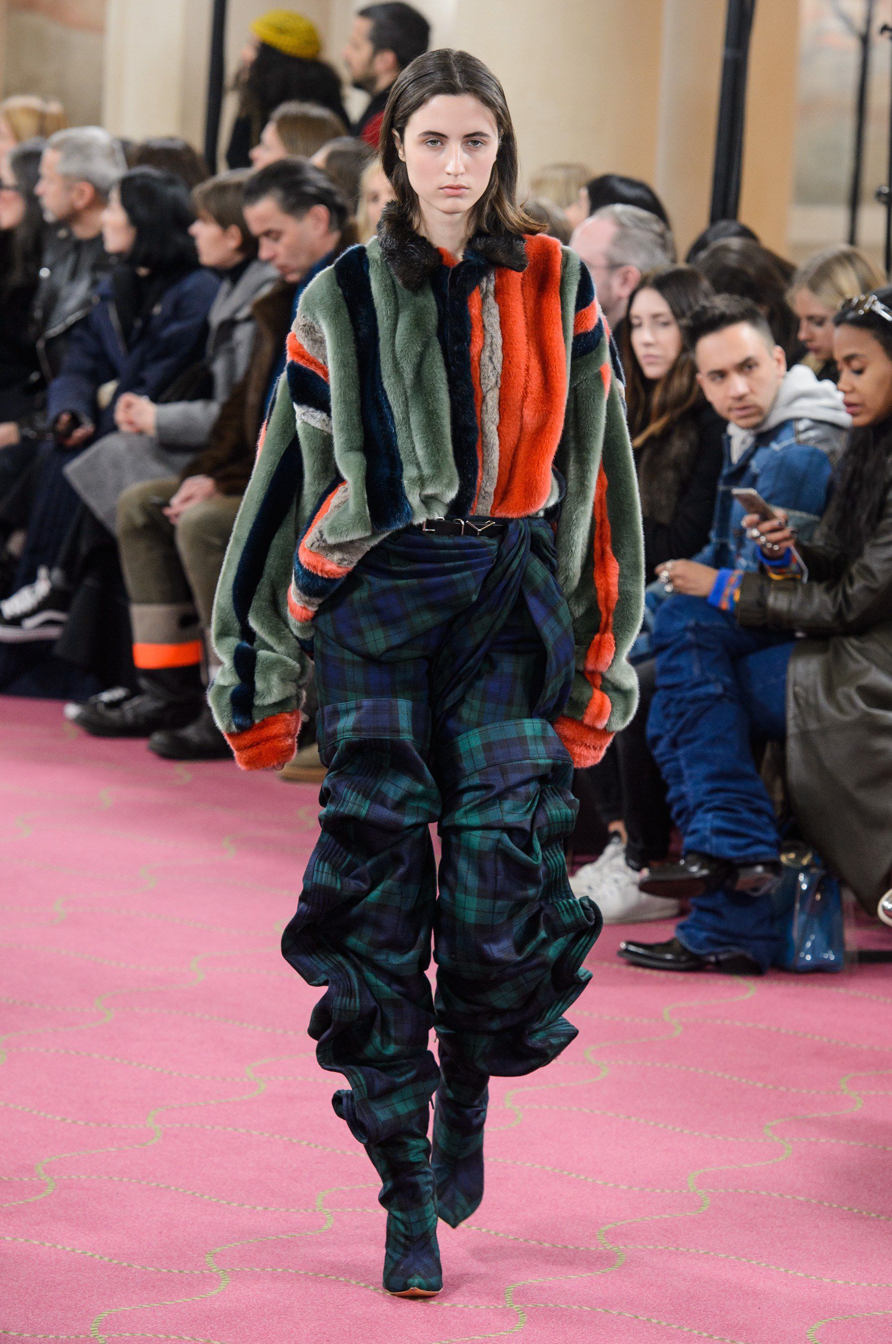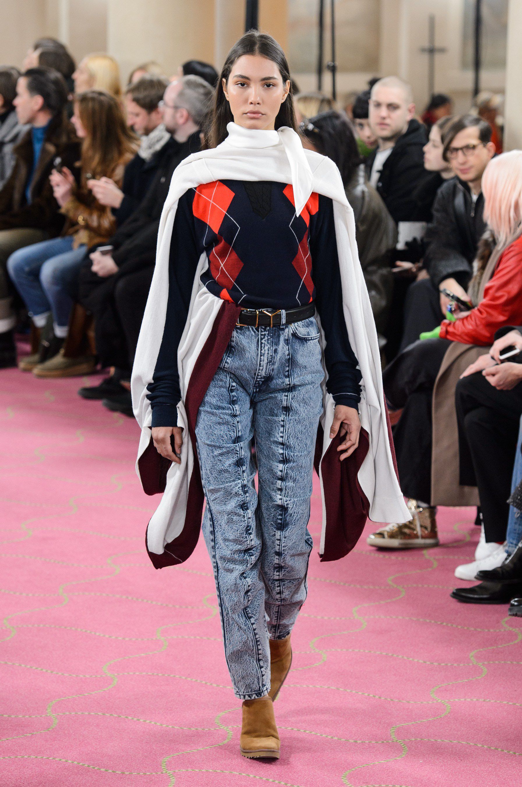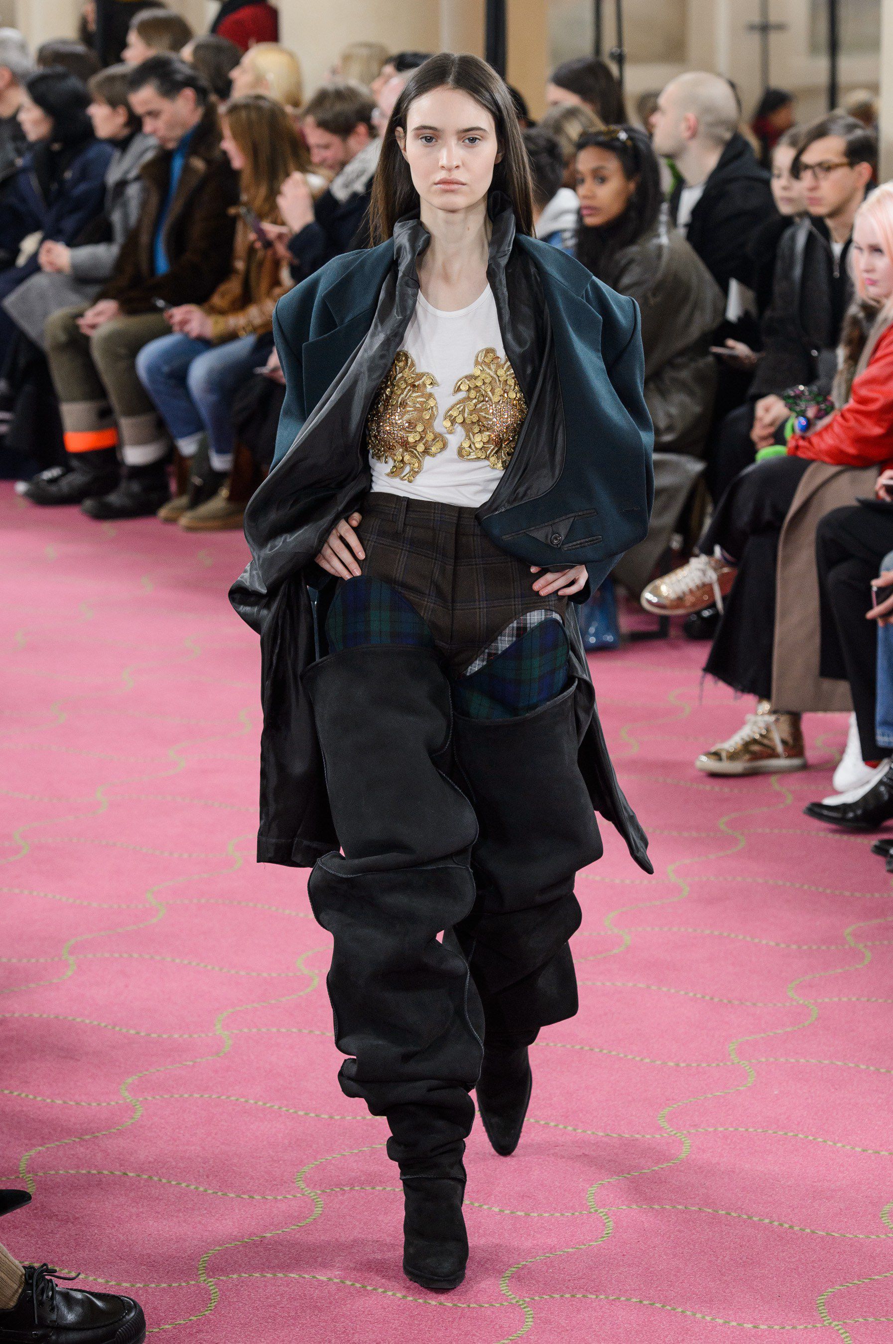 Tra i pezzi standouts impermeabili, maglioni e abiti di seta che spuntano come strati di torte millefoglie, jeans lavati con acido con un orlo multistrato, una tenda sfrangiata trasformata in una gonna a spirale, pantaloni di velluto a coste con una foglia di fico ricamata sul cavallo, cappotto di raso avvolto con pelliccia, classici maglioni a strisce abbinati a gonne drammatiche e alle eccentriche sagome denim.