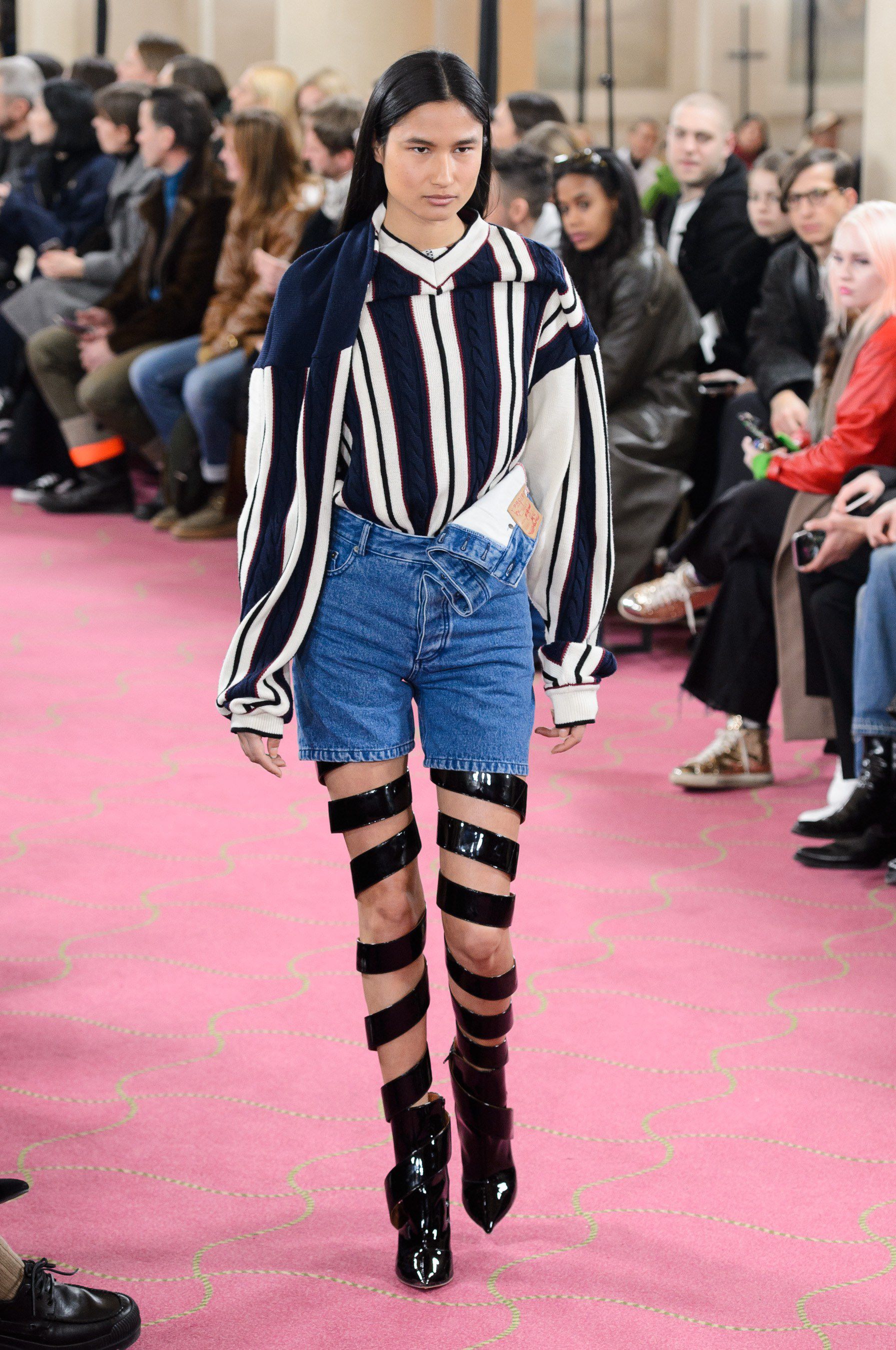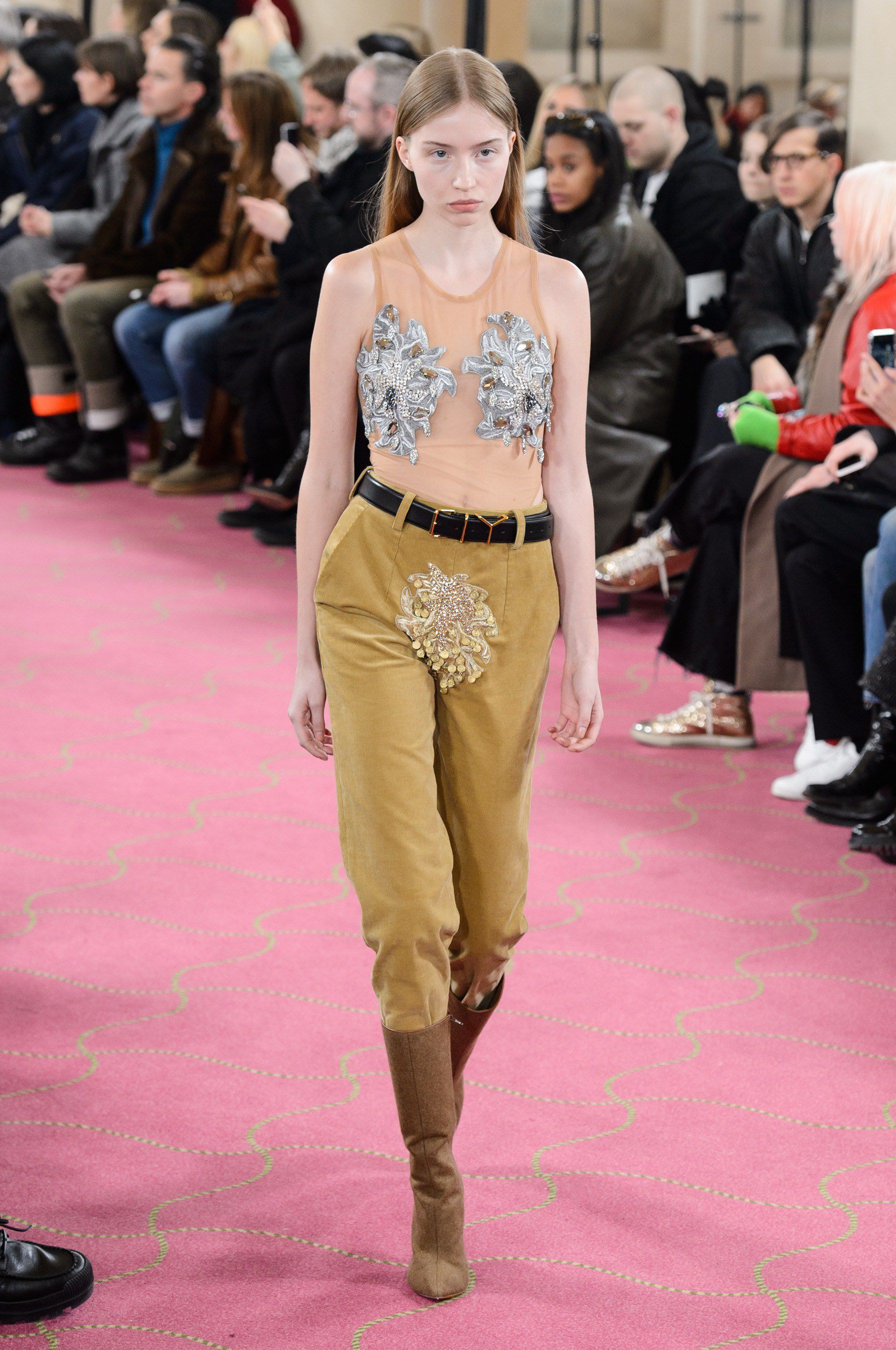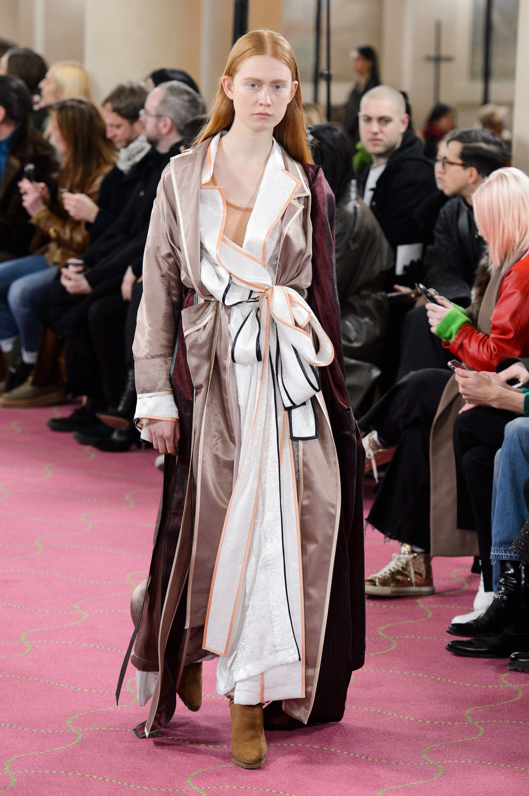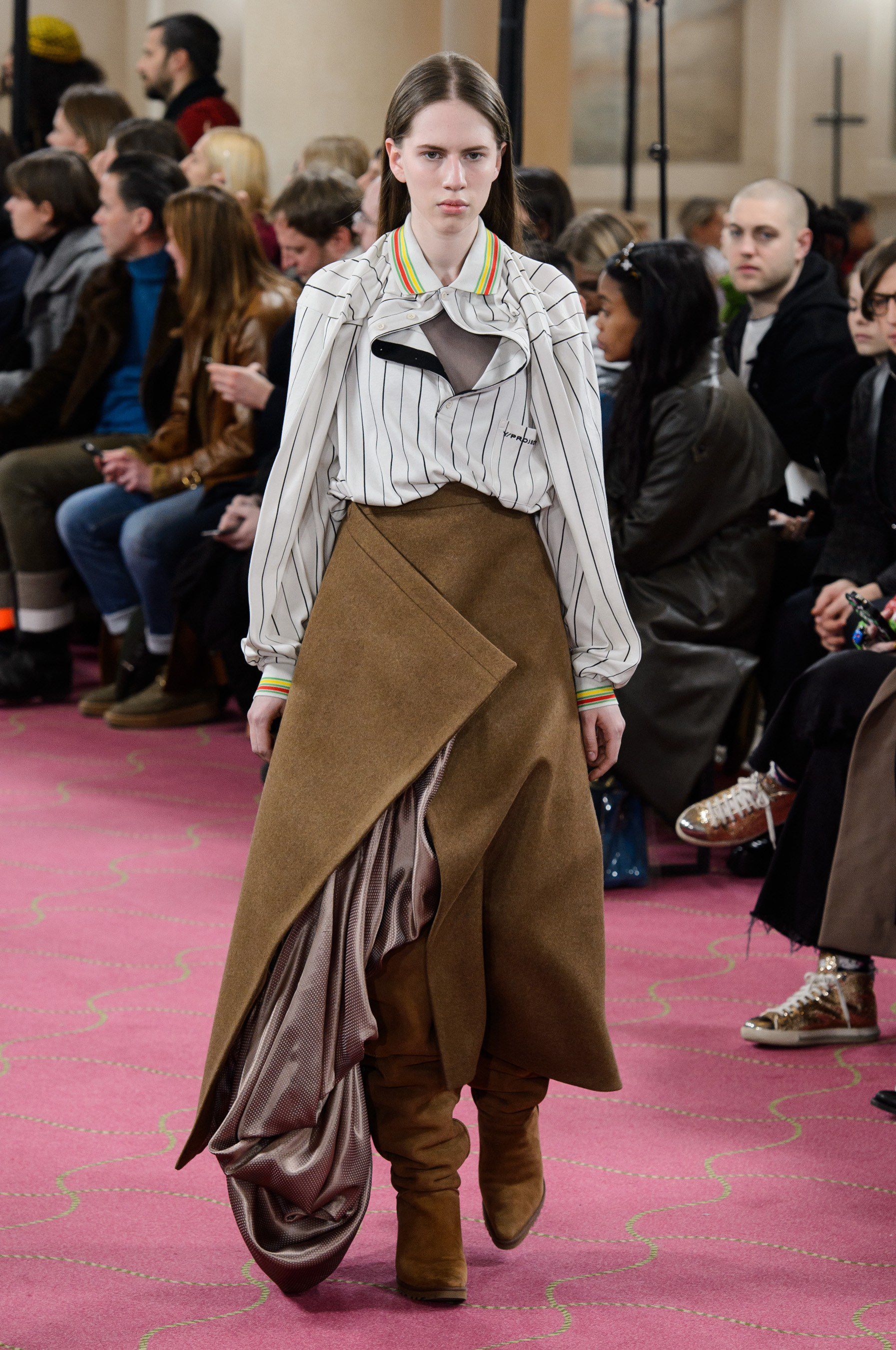 Tra i pezzi standouts impermeabili, maglioni e abiti di seta che spuntano come strati di torte millefoglie, jeans lavati con acido con un orlo multistrato, una tenda sfrangiata trasformata in una gonna a spirale, pantaloni di velluto a coste con una foglia di fico ricamata sul cavallo, cappotto di raso avvolto con pelliccia, classici maglioni a strisce abbinati a gonne drammatiche e alle eccentriche sagome denim.