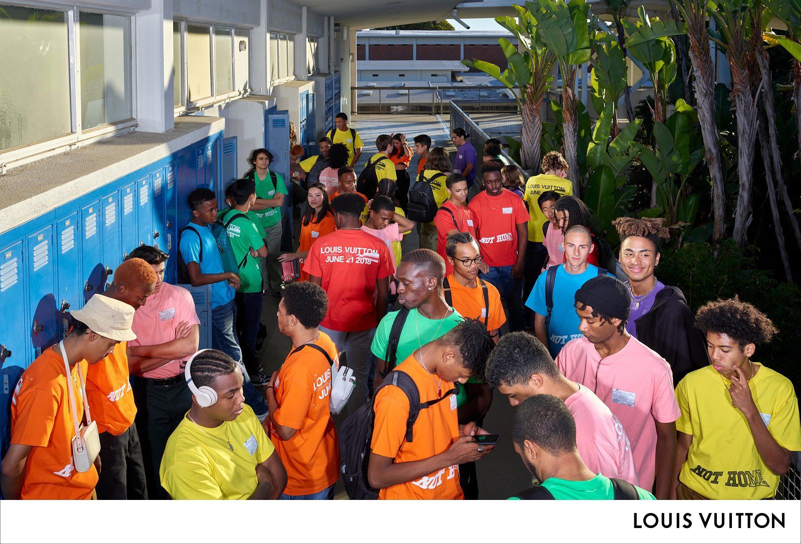 Nelle immagini compare un gruppo di studenti vestiti con t-shirt colorate, un evidente riferimento ai 1500 studenti in outfit arcobaleno invitati da Virgil ad assistere alla sua prima sfilata per Louis Vuitton. Osservando attentamente tutti gli scatti di questa campagna pubblicitaria è facile capire le parole del fondatore di Off-White: