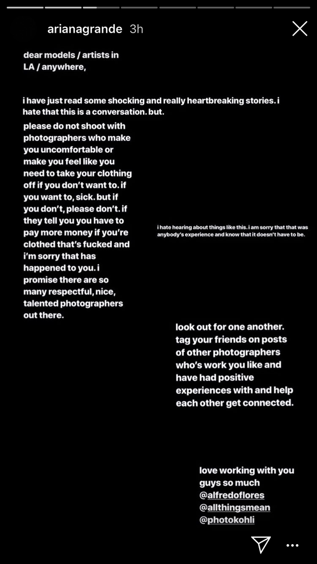 Dopo la diffusione degli screenshot su Instagram era impossibile continuare a ignorare la questione, per cui anche le tante celeb con cui Hyde ha lavorato sono state costrette a dire la loro. Ariana Grande ha fatto una dichiarazione sempre attraverso una IG Story: