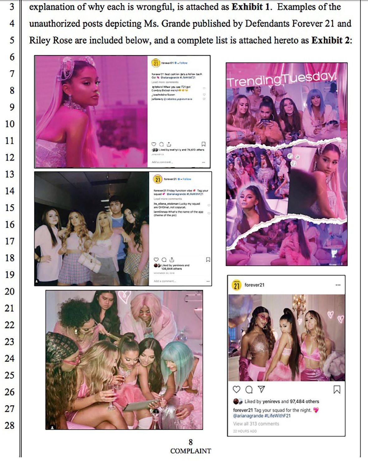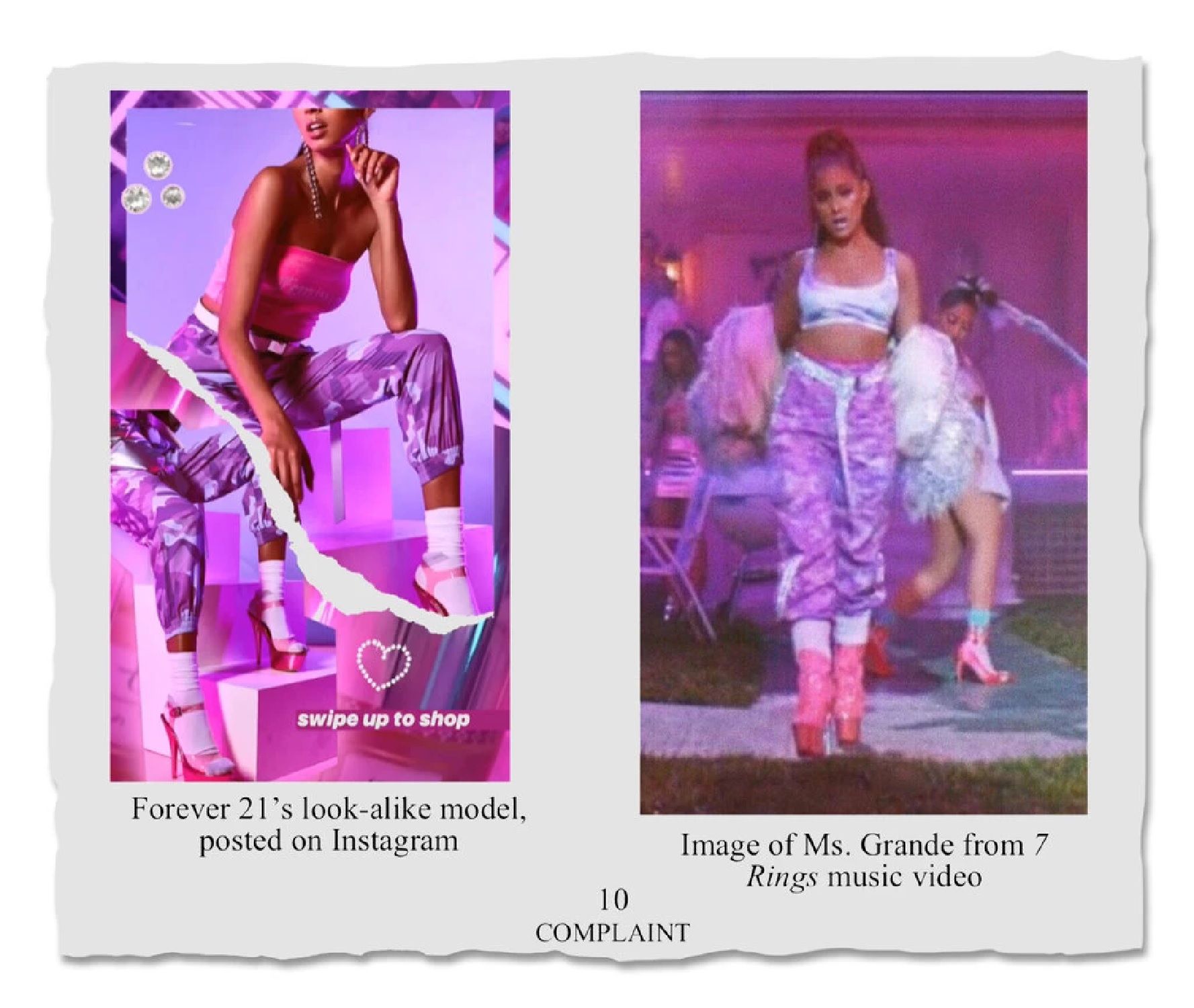 Nella denuncia degli avvocati della star depositata presso il tribunale federale in California lunedì scorso, si legge che dopo che un accordo tra la cantante e il marchio non era andato a buon fine a causa della “riluttanza di Forever 21 a pagare il valore di mercato equo per una celebrità della statura della signora Grande”, l’azienda “ha rubato il suo nome, somiglianza e altre proprietà intellettuali per promuovere il loro marchio gratuitamente”. Il riferimento è ad una campagna del fashion retailer che comprende più di 30 foto e video in cui una modella dalla somiglianza “inquietante” con Ariana posa con abiti, styling, grafica e concept palesemente ispirato al video di 7 Rings. Ad esempio, appaiono quasi identici al look della Grande un top argentato di pailettes, un accessorio per capelli, un set a due pezzi rosa con una cintura argentata. Per amplificare l’effetto doppelgänger, la modella sfoggia persino un ponytail extralong, acconciatura simbolo della star. Il marchio, però si è spinto ancora oltre, “utilizzando audio e testi” del singolo 7 Rings e includendo “il caratteristico 7 del video della canzone nel background" e nelle didascalie della campagna.