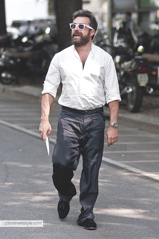 Proseguiamo con Giorgio Armani alle ore 10.30. Innovativo sì, ma sempre con stile. Questa la vera forza di Re Giorgio che da anni contraddistingue e rappresenta il gusto italiano nel mondo. Una gamma cromatica neutra che sfocia dal bianco al beige, dall'antracite al blue avion. Forme morbide, per nulla strutturate; insomma il disegno di un uomo che predilisce il confort, ma con classe.