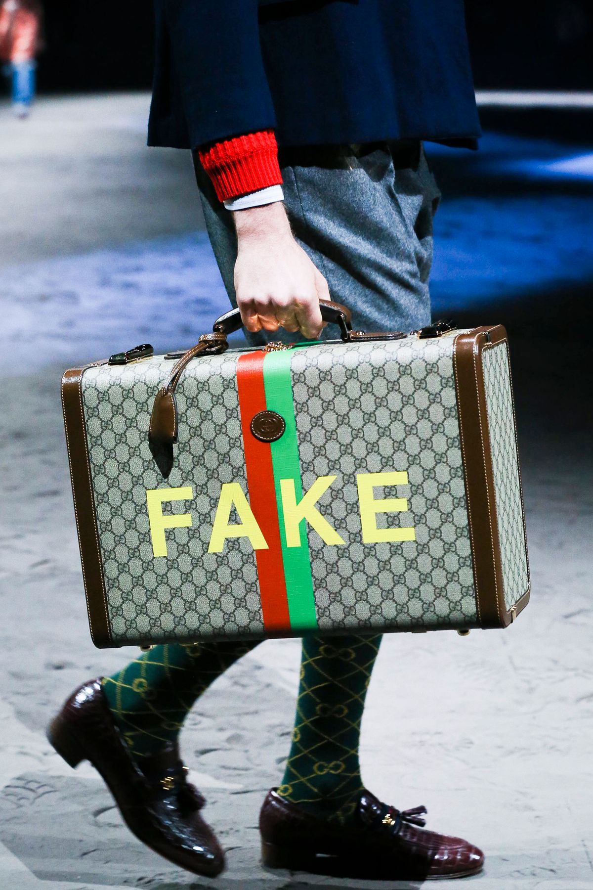 Alessandro Michele ha abituato il pubblico a un’estetica massimalista e vistosa, ma la borsa e il baule avvistati allo show della collezione Uomo FW20 sembra essere il pezzo più ironico mai prodotto da Gucci. Una borsa in pelle e una valigetta, decorate con il classico monogramma con la doppia G e la doppia banda colorata rossa e verde con sovraimpressa una stampa cubitale gialla con la scritta “Not Fake”, di cui ciascuna parola è stampata su un lato. Portandole in mano, solo la scritta “Fake” è visibile, quasi una doppia frecciata ironica alla counterfeit culture di cui Gucci è spesso vittima e all’ossessione dei consumatori per l'autenticità dei capi.