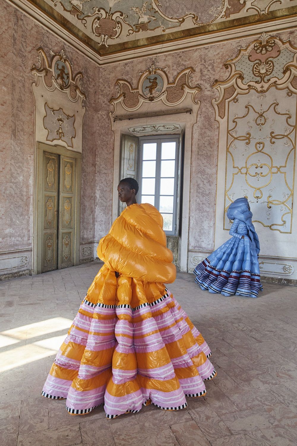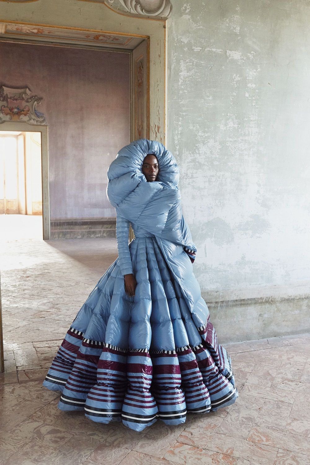 Dopo l’arte da indossare di Craig Green e l’estetica minimale di 1017 ALYX 9SM, tocca ora a Pierpaolo Piccioli svelare la sua collaborazione con Moncler, capitolo finale di Moncler Genius, il progetto inaugurato da Remo Ruffini a febbraio 2018 e che affida a talenti del mondo della moda come Simone Rocha e Francesco Ragazzi di Palm Angels la reinterpretazione dei codici del proprio marchio. Il designer di Valentino prende l'iconico puffer dell’azienda fondata nel 1952 a Monestier-de-Clermont e lo trasforma in una serie mozzafiato di voluminosi abiti in nylon laqué, lunghi fino a terra, con gonna a ruota, mantelle e giacche col cappuccio caratterizzati da cuciture in piuma d’oca. Declinati in una palette che va dal bianco e nero al rosa pastello e al giallo giunchiglia, i capi sono resi ancora più speciali da motivi ispirati alle stampe dei tessuti africani nati dalla collaborazione con la modella Liya Kebede, che con il suo brand Lemlem sostiene attivamente l’artigianato locale.