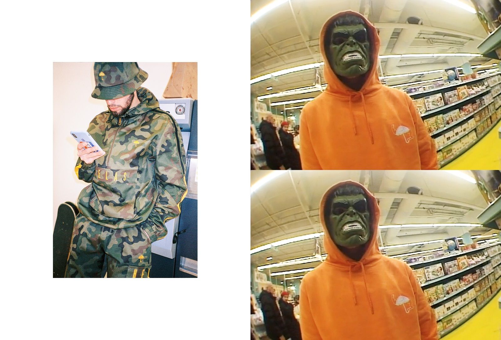 La collezione comprende capi pratici e casual come le tarcksuit "Gang" full black & full camo, i pantaloni del pigiam con il sole stampato. Non mancano, poi, le classiche t-shirt, felpe con cappuccio e accessori con l'iconico logo dell'ombrello Helas. Questa volta c'è persino un originale mazzo di carte.