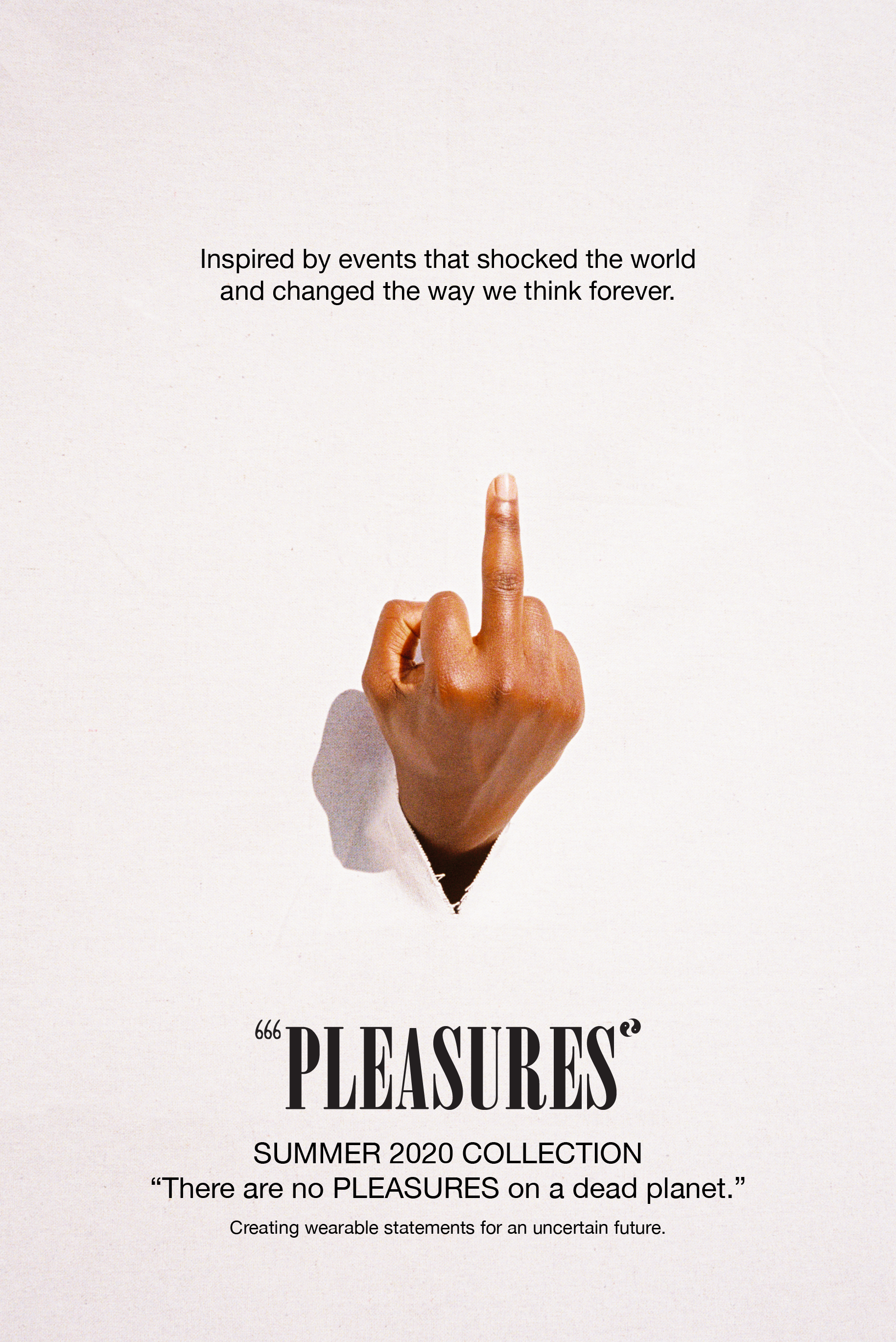 La collezione presenta pezzi unici disegnati per un futuro incerto, che includono nel loro design messaggi d'importanza globale stampati e ricamati su polo, pantaloni di nylon, pantaloncini, camicie in rayon, giacche leggere e un assortimento di jeans. Tra gli item della collezione spiccano anche i Beatnik, le calzature nate dalla collaborazione tra PLEASURES e Reebok.