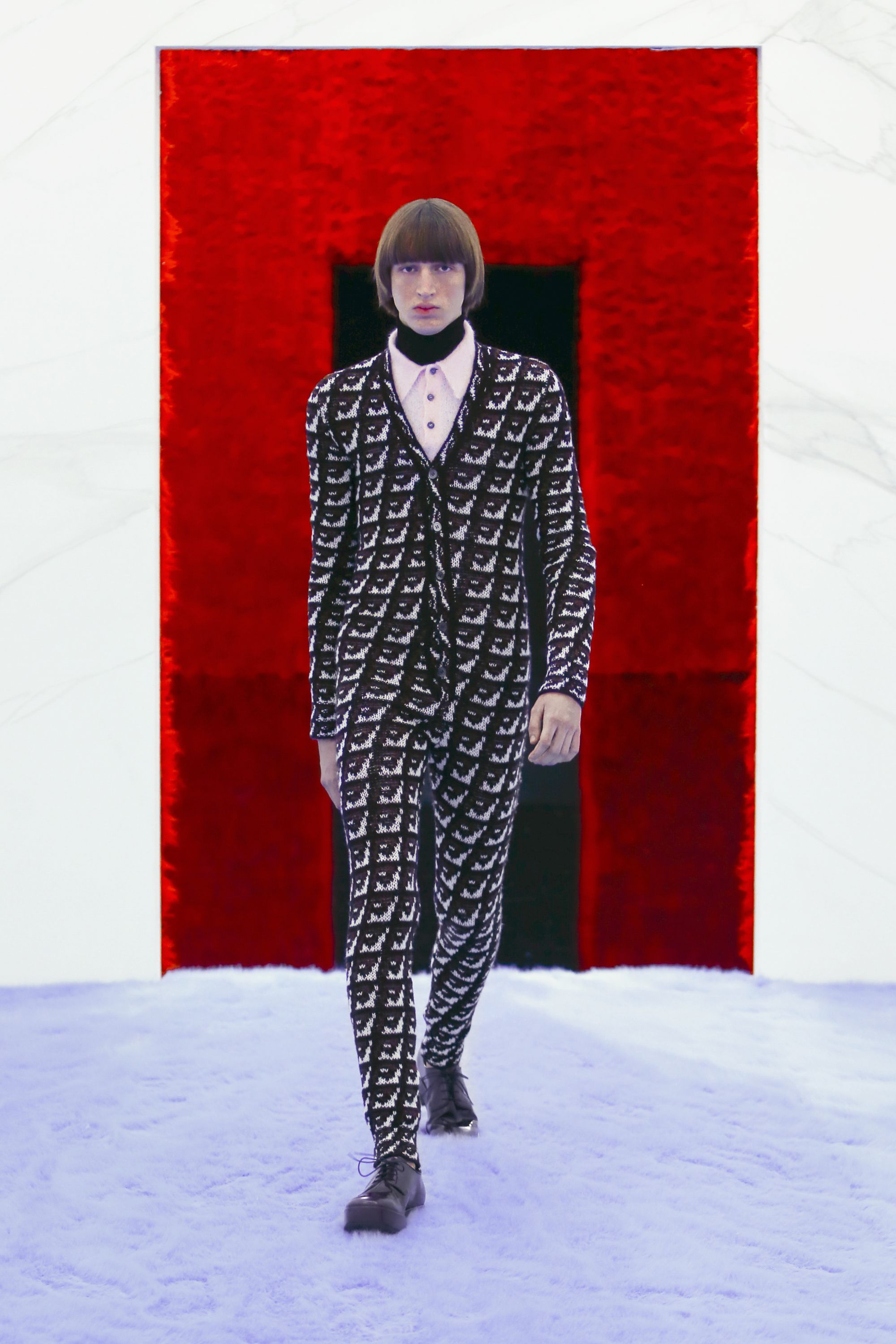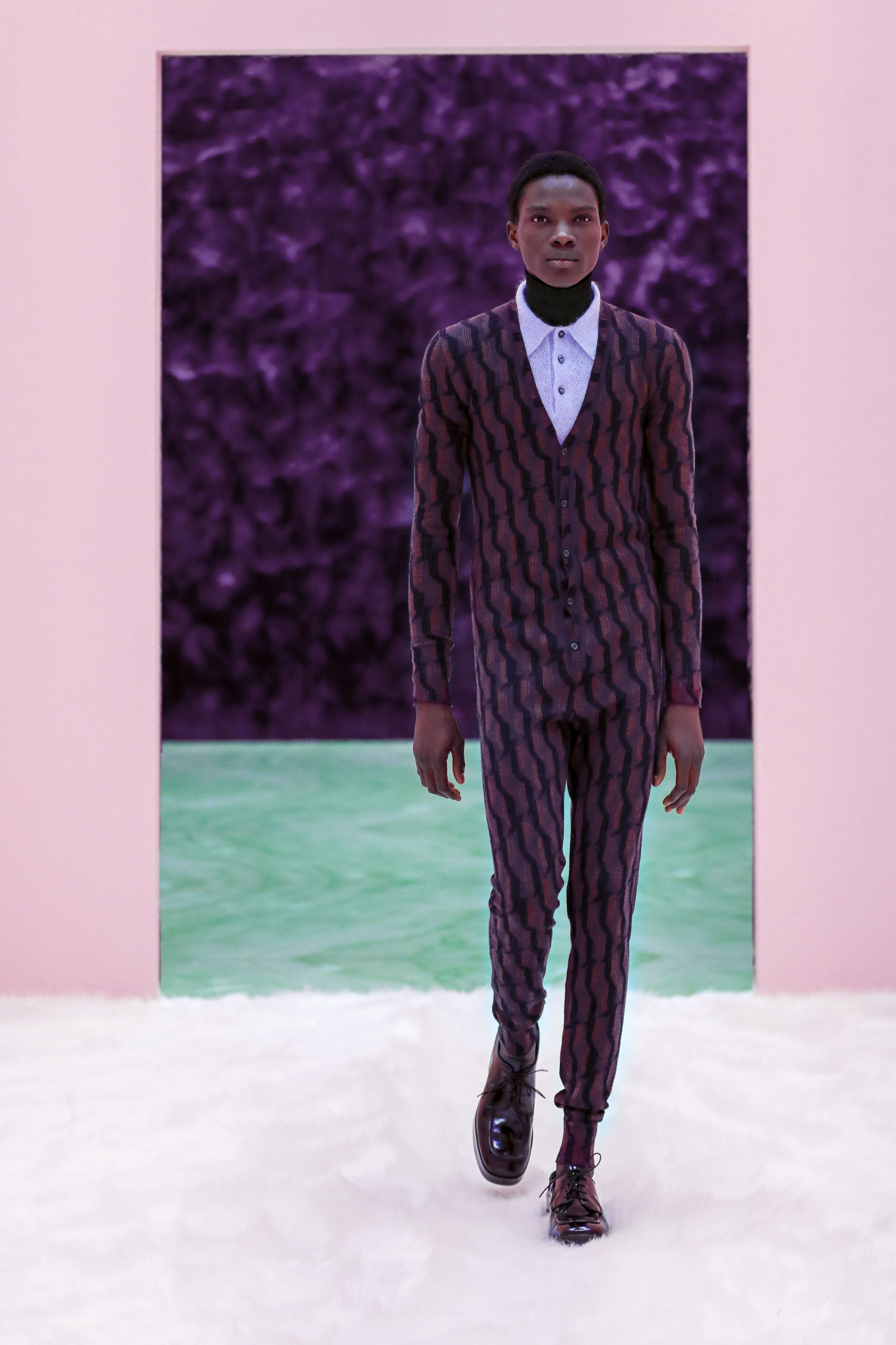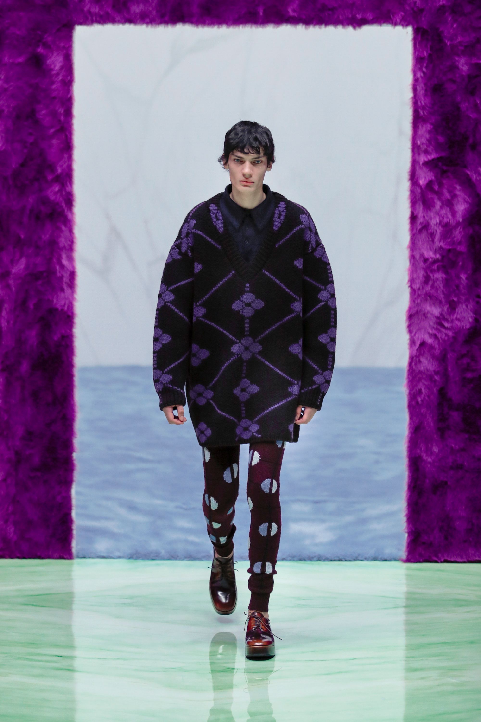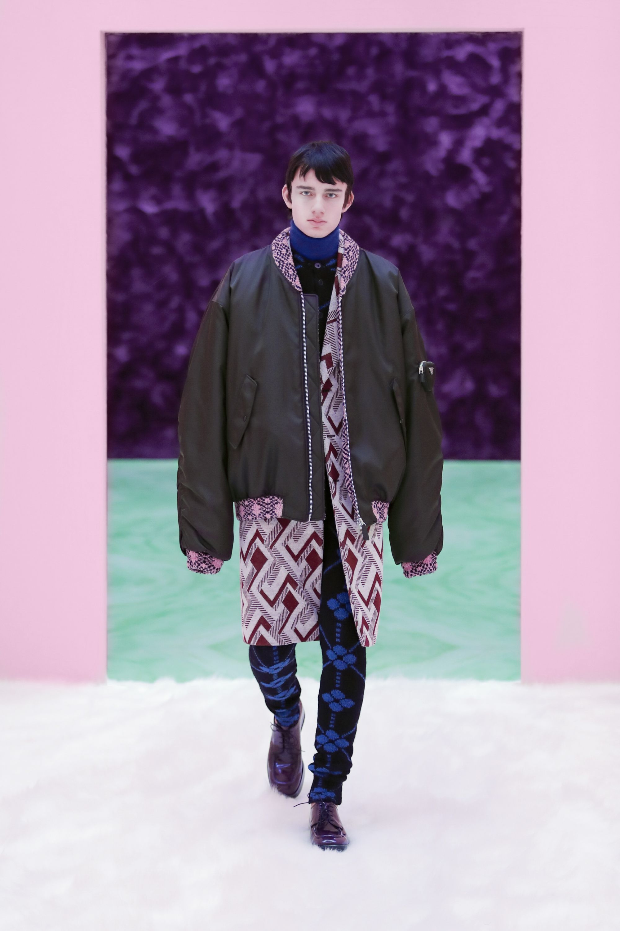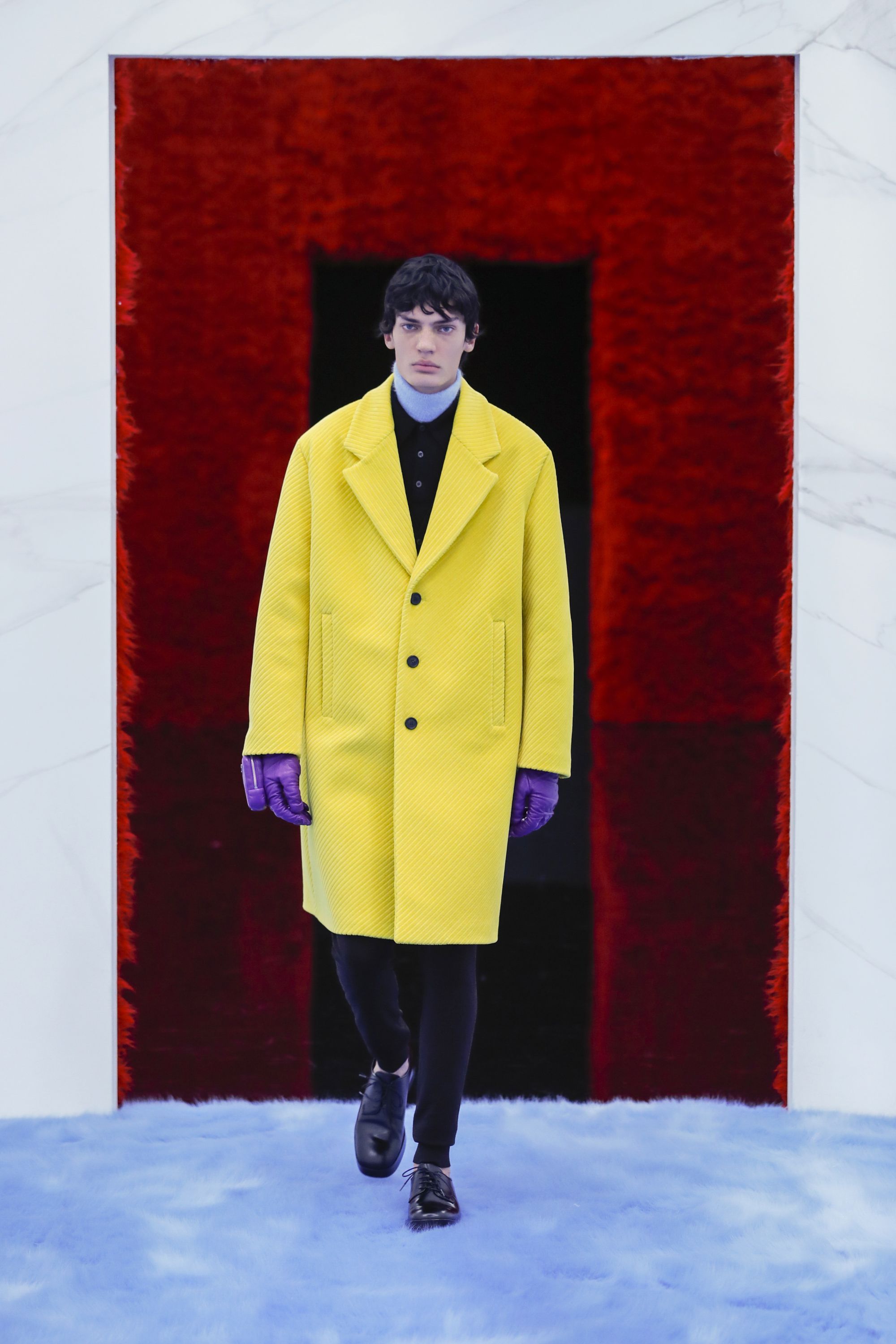 Si è svolta ieri la prima sfilata maschile di Prada co-firmata da Miuccia e Raf Simons – uno show digitale animato, più che da uno storytelling vero e proprio, dalla ricerca di una nuova dimensione (sia fisica che materica e sociale) per ristabilire una sorta di armonia o equilibrio fra individuo e mondo. Una ricerca che, per quanto intimistica voglia sembrare, nasconde un’energia sotterranea e pulsante: se infatti la successione di stanze decorate di materiali e colori diversi ricorda sia i mondi a scatola chiusa pensati da Simons nei set della sua prima collezione per Dior, in cui le pareti erano interamente ricoperti da fiori divisi in base al colore; la musica di Richie Hawtin che accompagna i 54 modelli e i passi di danza degli stessi parlano di un desiderio di dinamicità e movimento, sopito sotto gli elaborati layering di lana, che è stato molto diffuso in tutte le sfilate di questa Milan Fashion Week con le loro colonne sonore da boiler room. Visti i risultati, però, rimane ancora una volta in dubbio il tipo di equilibrio creativo raggiunto dai due: in altre parole, a circa un anno dall'annuncio ufficiale dell'ingresso di Raf Simons in Prada, ci si sarebbe atteso qualcosa che definisse una nuova estetica nata dalla fusione delle idee di entrambi i designer - una reazione chimica che non sembra essersi verificata finora con una collezione che, pur validissima, parla le due lingue dei suoi creatori ma non le sintetizza in un singolo codice nuovo.