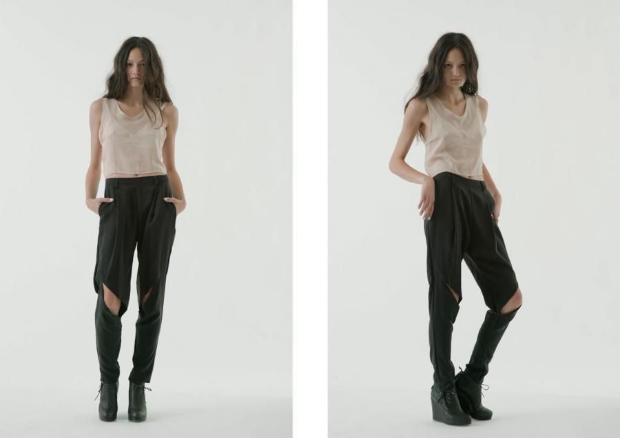 For the ss 2012 collection she presents Polymorphic light explosion. The colours, pale pink, olive green, white, black, and the materials, silk and organdie, are both ethereal, soft, light. The lines are deconstructed, the blazers are oversized, the skirts maxi, the trousers have cuts on the knees, but also the dresses have some of them.