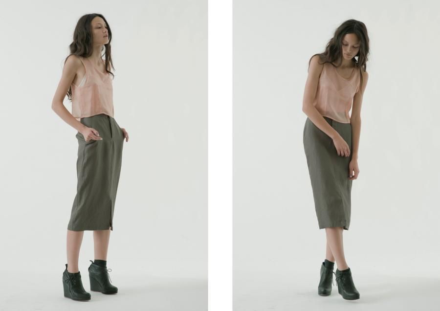 The designer about her collection says: “I wanted to show this contrast in attitudes toward the summer light and heat in the collection with bright sheer silk and organza in cropped tanks and shorts and then heavier, darker toned linen coats and longer skirts and dresses”.