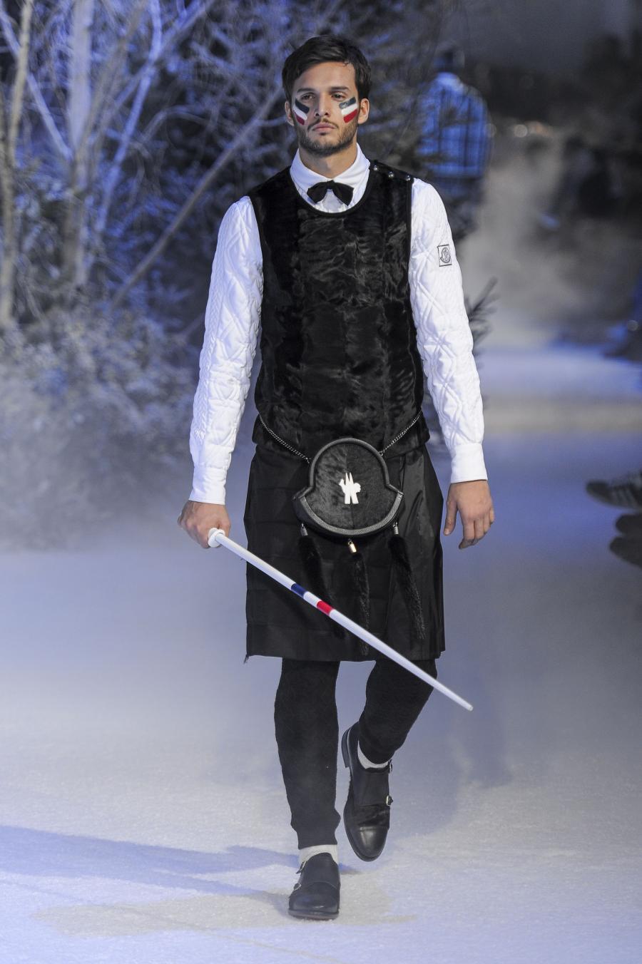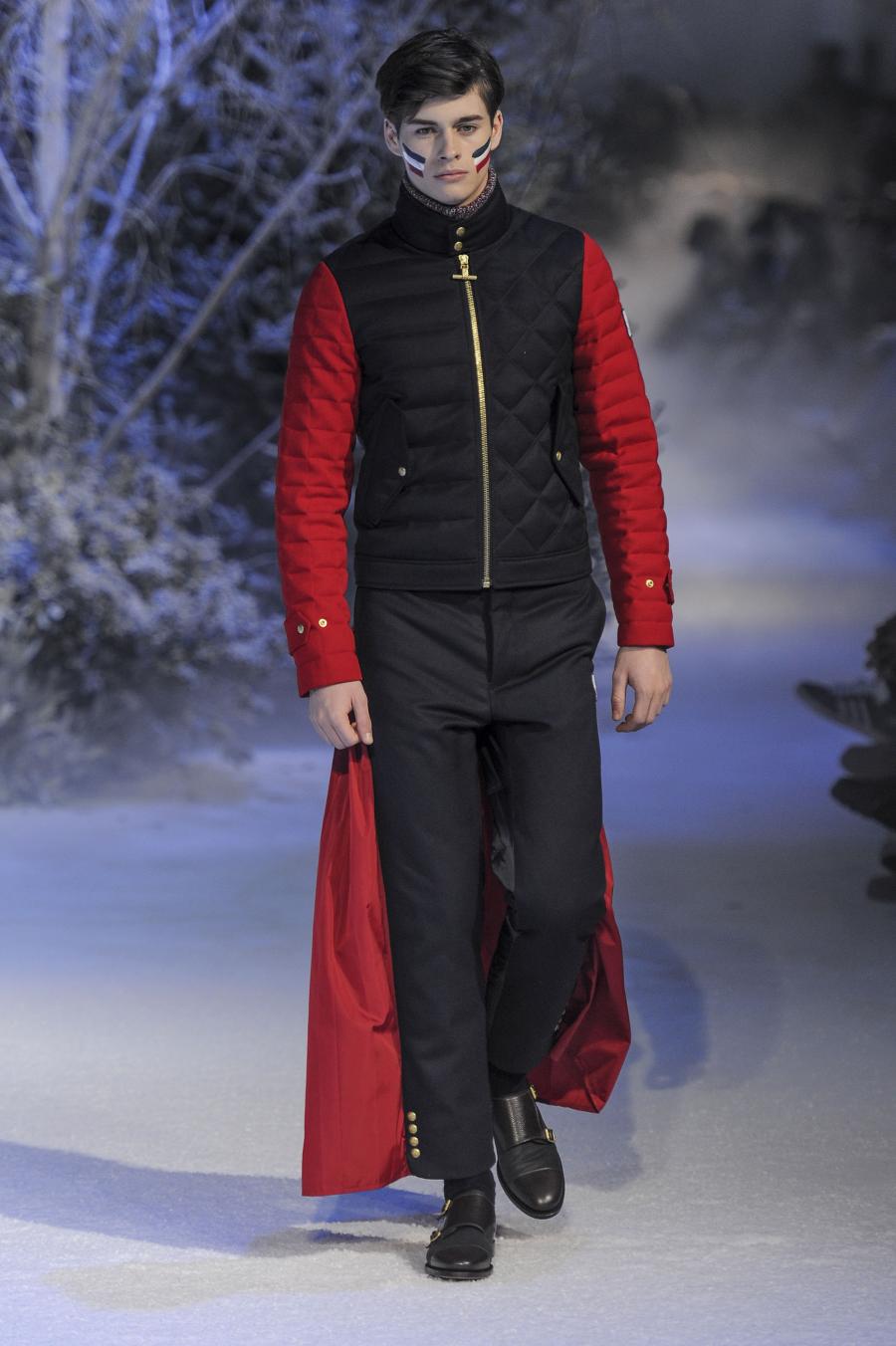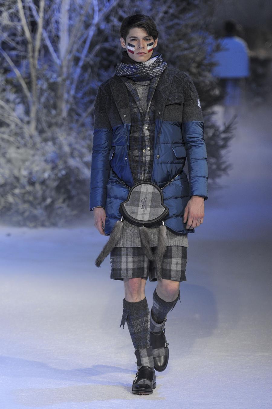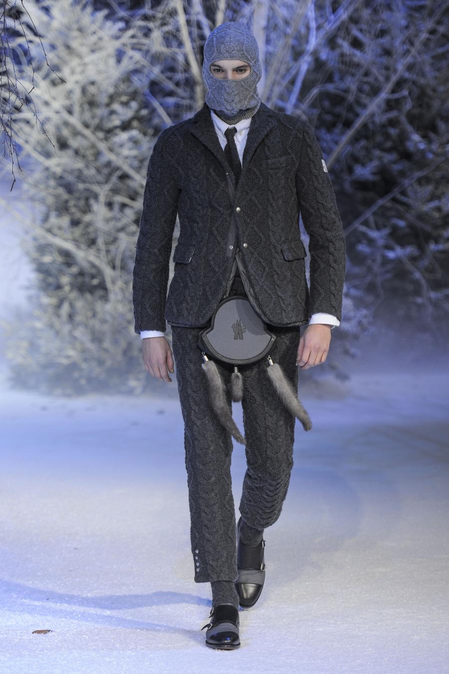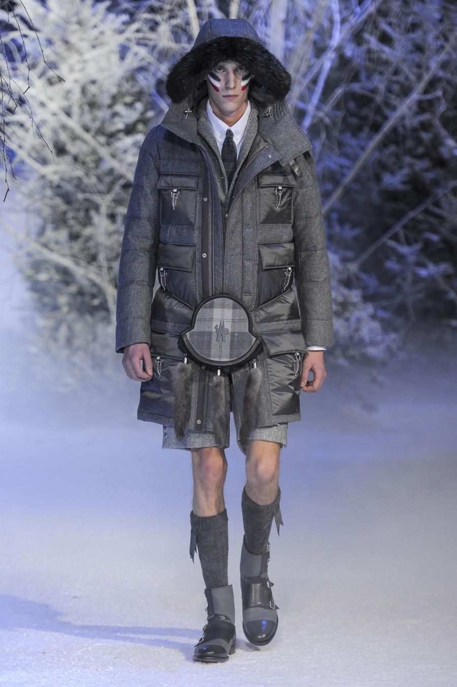 Milano, Gennaio 2013. Moncler, anche per questa prossima stagione, continua a mantenere salda la sinergia tra sensibilità sartoriale, che contraddistingue l'intero lavoro creativo di Thom Browne, e l'active sportswear, tratto distintivo della casa francese. Il concept dell'intera collezione ruota intorno all'immaginario della cultura giapponese, dove le uniformi di valorosi e coraggiosi samurai, richiamando le highland scozzesi nelle cromie di un profondo blu, rosso e nero, acquisiscono un valore più contemporaneo senza, però dimenticare la tradizione british. Valore aggiunto è rappresentato sempre dall'outwear, dove l'accurata scelta di materiali tecnici e l'abilità stilistica di Thom regalano capispalla in bilico tra passato e innovazione.