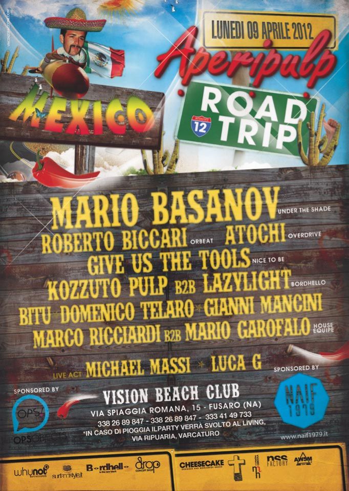 Quando si viaggia troppo spesso ci soffermiamo più sulla meta che sul viaggio stesso, dimenticandoci di quanto è importante tutto il percorso, il cammino che c'è dietro alla riuscita di qualcosa. Per questo noi dell'Aperipulp abbiamo deciso di iniziare questa stagione, fatta di musica e divertimento, arte e design, scenografie sofisticate e special guest internazionali, cambiando luogo, presentando così un evento del tutto itinerante ma che conservi allo stesso tempo la nostra filosofia di puro divertimento. Infatti per il nostro classico battesimo del fuoco nel giorno dell'Angelo, abbiamo scelto una location d'eccezione. Il Vision Beach rappresenta il nostro luogo incantato, la nostra prima tappa di un viaggio chiamato estate. A fare da colonna sonora alla prime corse in spiaggia, ai baci rubati e ai Mojiti ghiacciati, abbiamo invitato un ospite di fama internazionale che con il suo sound ricercato ha catturato l'attenzione dei media e dei clubbers più accaniti: Mario Basanov sarà il nostro direttore di orchestra, accompagnato dai nostri fedelissimi djs che infiammeranno i nostri primi balli estivi. Quindi Lunedi 9 Aprile dalle ore 12.00 inizia la nostra estate, che se l'anno scorso abbiamo salvato, quest'anno abbiamo deciso di portarla ovunque e di condividerla con tutti. Non saranno i posti a fare la differenza, ma la strada e la nostra musica, il divertimento e l'atmosfera che solo l'Aperipulp sa regalare.